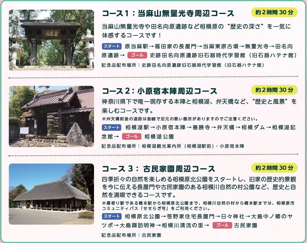 コース :当麻山無量光寺周辺コース、小原宿本陣周辺コース、古民家園周辺コースの3コース