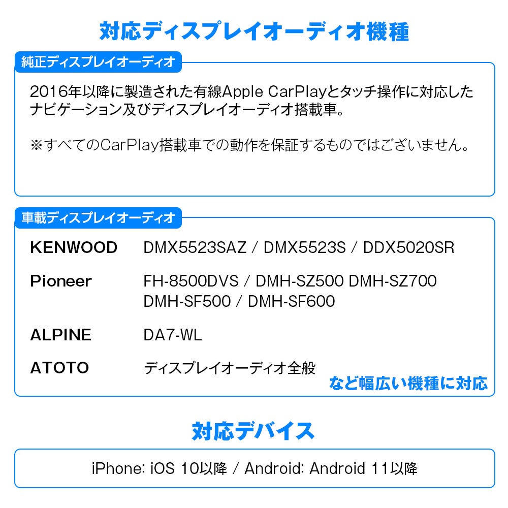 有線接続でCarPlay/Android Autoに対応し、タッチパネル操作が可能なディスプレイオーディオ搭載車両(一部車両を除く)。※輸入車(BMW・Volvo・テスラなど)・一部の国産車(MAZDA・SUZUKI・NISSANなど)は非対応の場合があります。詳細は製品ページをご確認ください。