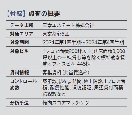 三幸エステート株式会社※1は賃貸オフィスビルに関する各種データを活用し、筑波大学 不動産・空間計量研究室※2と共同でオフィス市場の動向に関する調査を行っています。今回は2024年8月に公表したレポート※を更新し、2024年末までの現代的なアメニティに関する調査の結果を公表します。