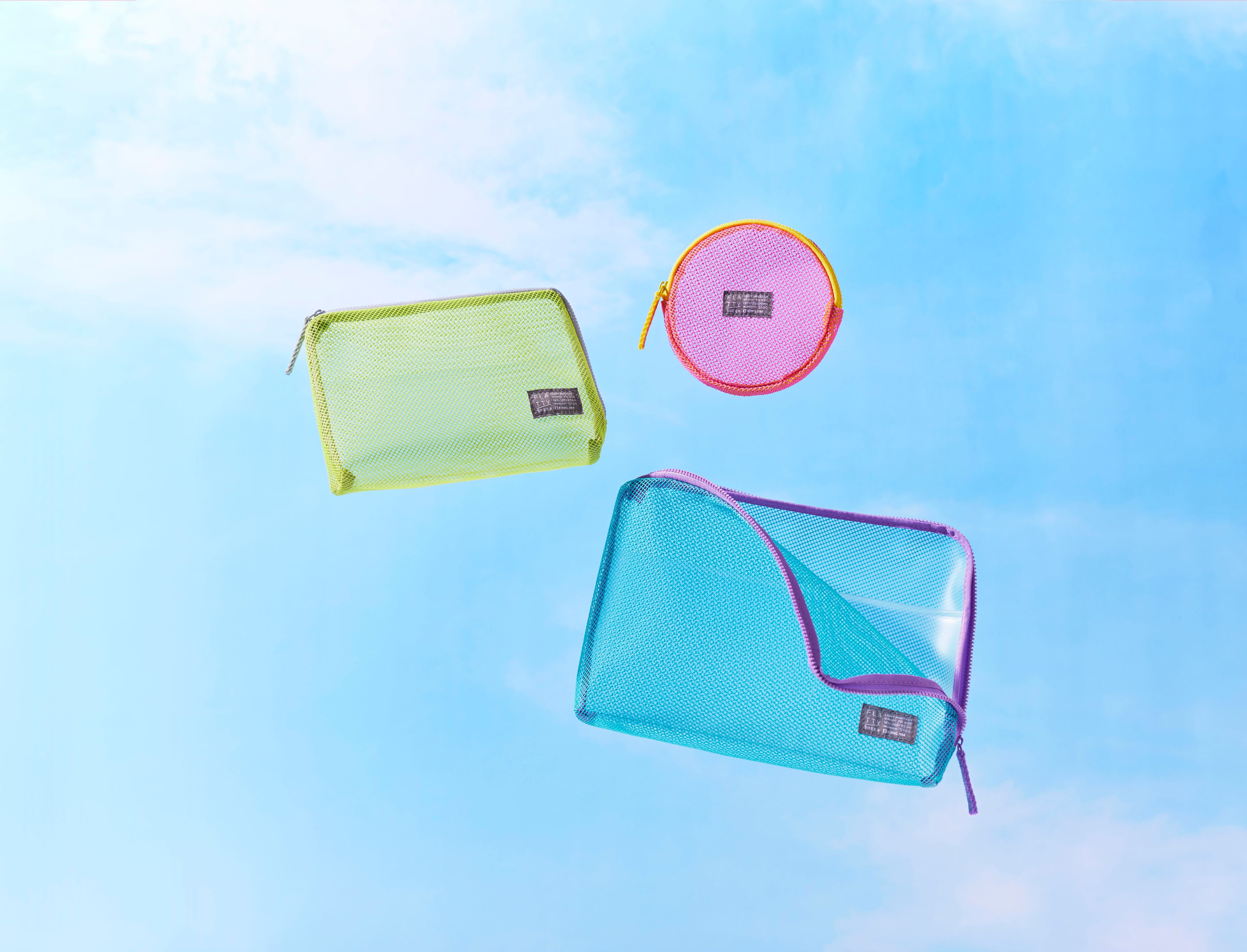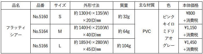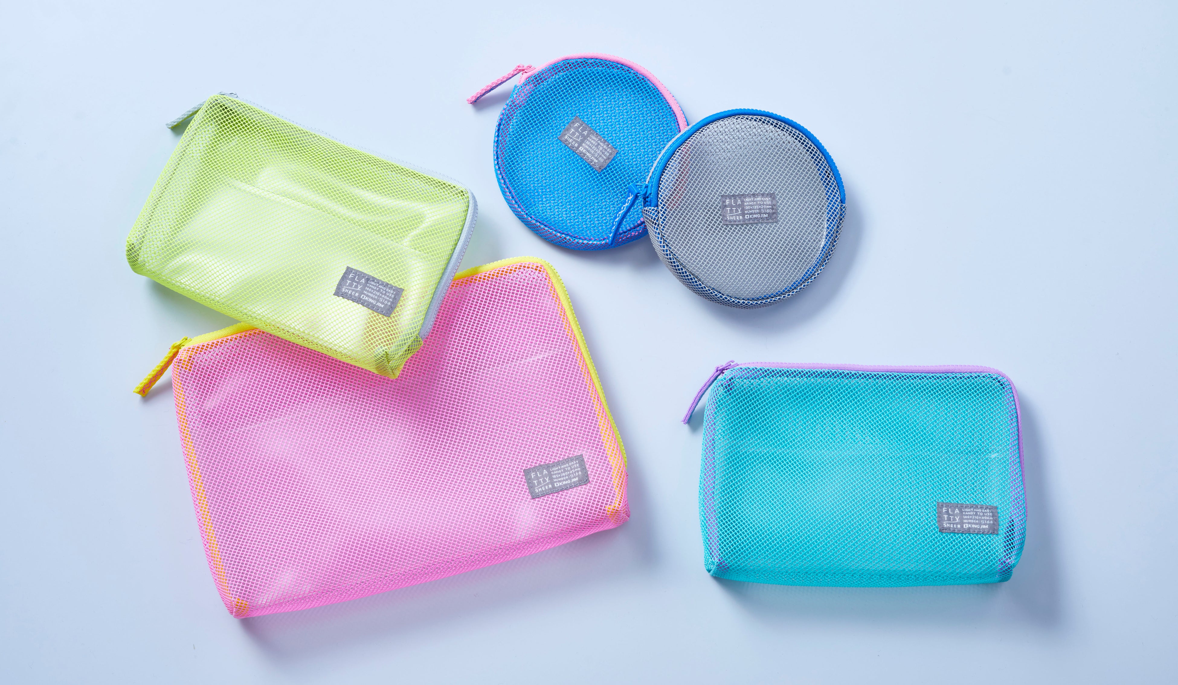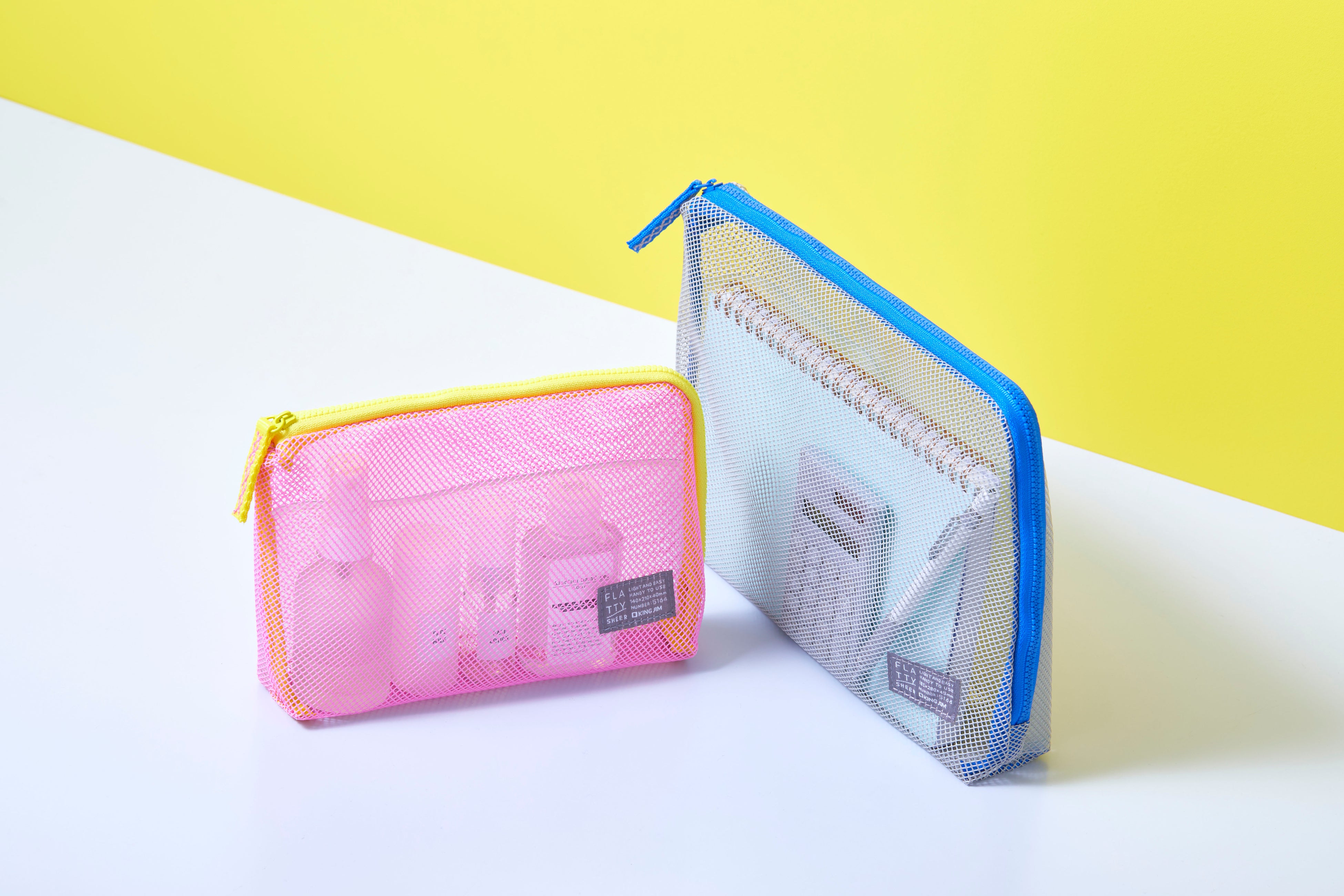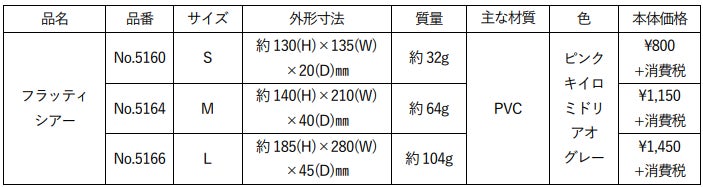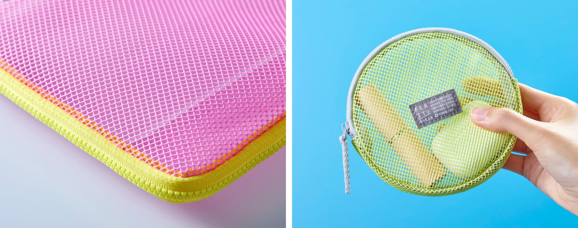 今回、その「フラッティ」シリーズに新たにメッシュ生地を採用した「フラッティシアー」を追加します。「フ ラッティ シアー」は軽量で型崩れしにくい「フラッティ」の機能性を活かした、メッシュ生地のポーチシリーズ です。メッシュ生地を採用したことで軽くて持ち運びしやすく中身が適度に見えるので、身の回りのアイテムの持 ち歩きや、トラベルグッズの収納にぴったりです。また芯材入りで型崩れしにくく、開口部が大きく開くので、中 身の出し入れもスムーズにできます。