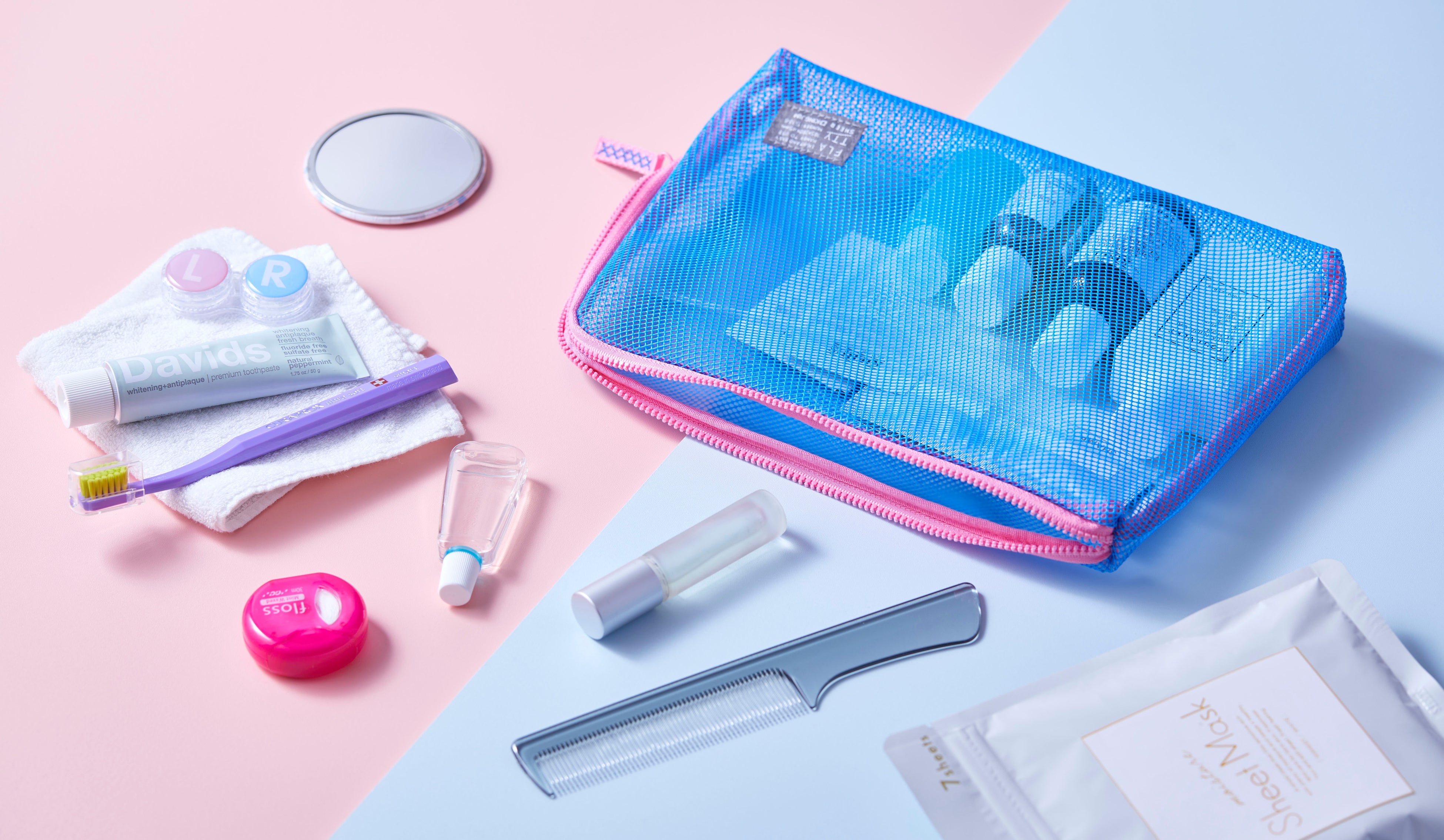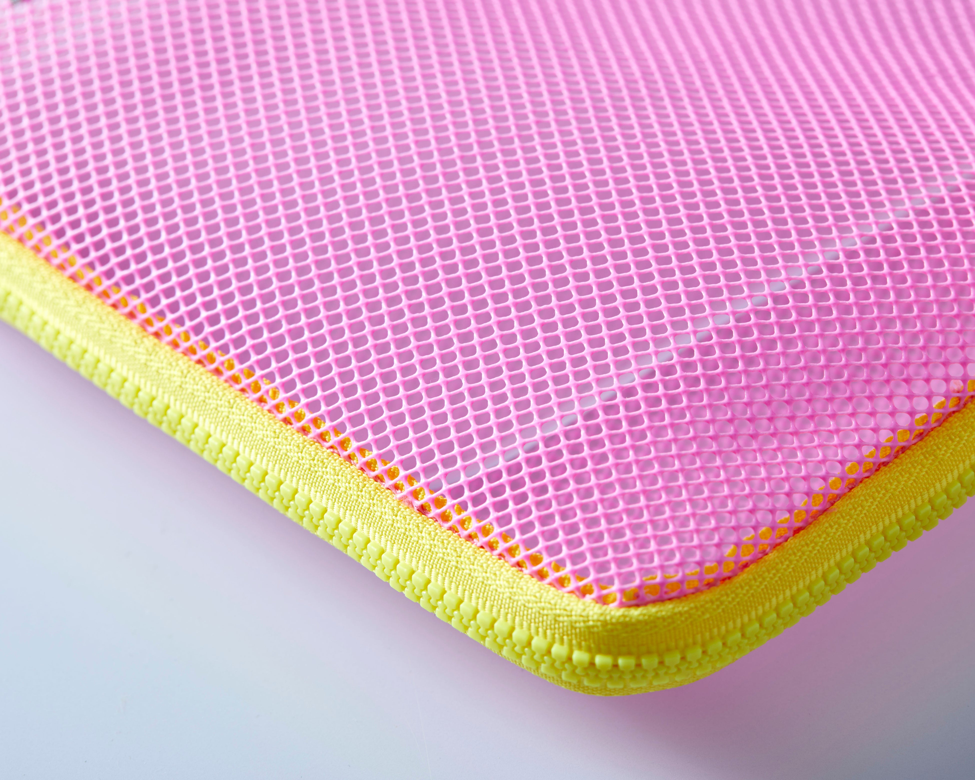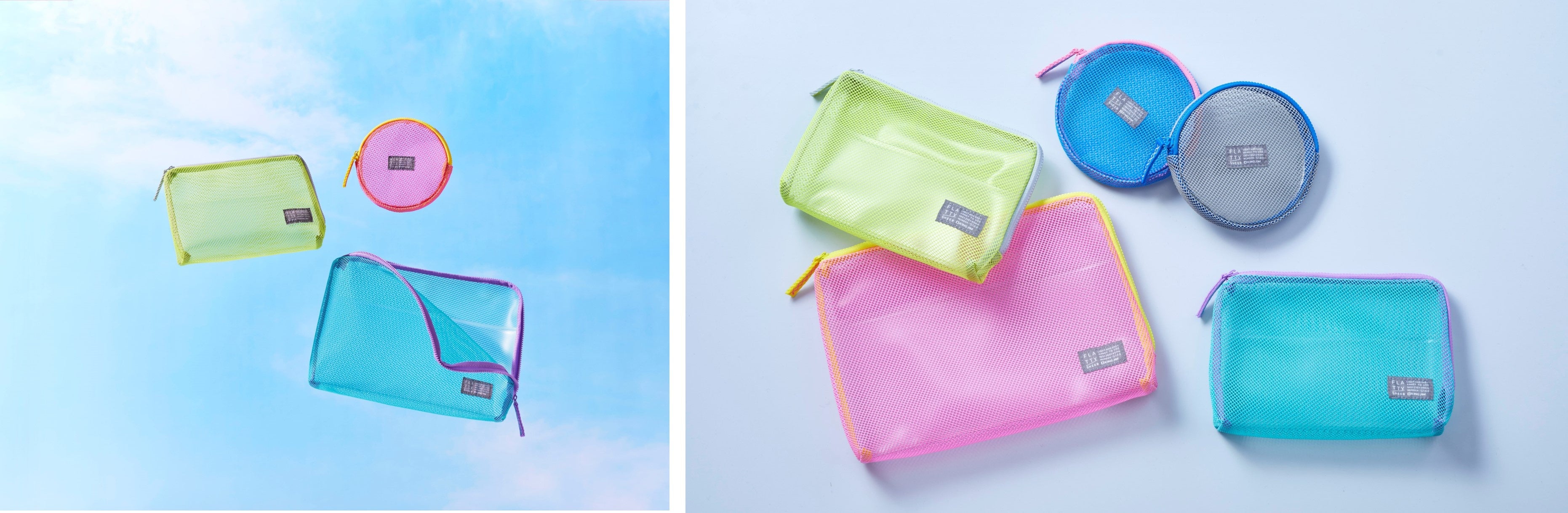 通気性のあるメッシュ生地で軽くて持ち運びしやすく、中身が適度に見えるのが特長です。