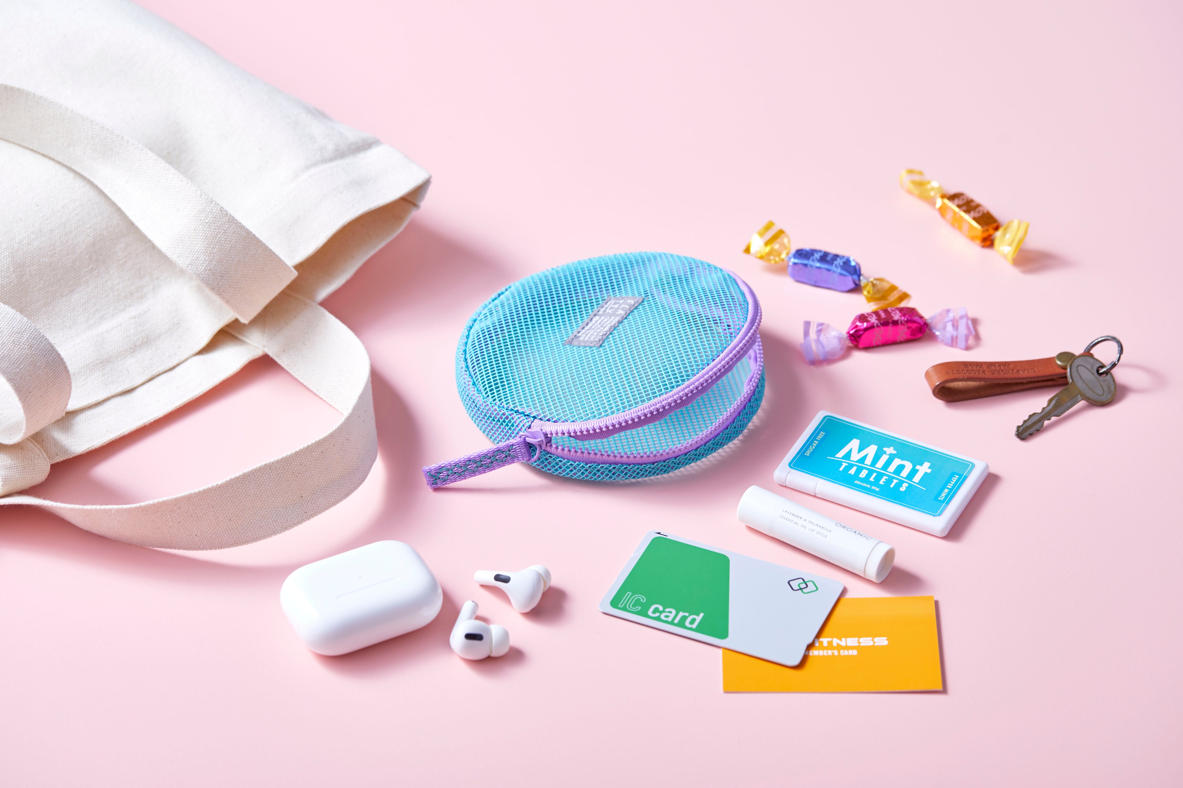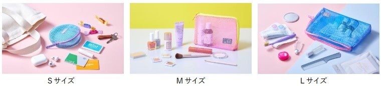 S サイズは円形のコンパクトサイズで鍵やリップクリーム、イヤホンなどの収納におすすめです。M サイズは化 粧品やモバイルバッテリーなどのガジェット類のような厚みのある小物の収納に、L サイズはA5 サイズの手帳や 電卓などのビジネスアイテムや、トラベルグッズなどの収納に便利なサイズです。