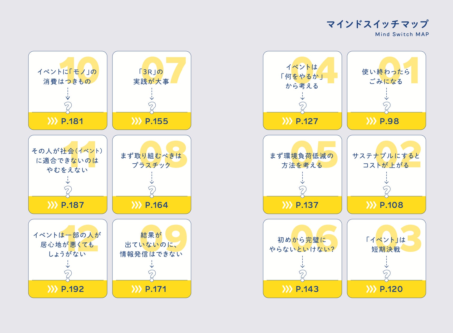 マインドシフトのスイッチを入れる「マインドスイッチマップ」/01 使い終わったらごみになる→?/02 サステナブルにするとコストが上がる→?/03 「イベント」は短期決戦→?/04 イベントは「何をやるか」から考える→?/05 まず環境負荷低減の方法を考える/06 初めから完璧にやらないといけない?/07 「3R」の実践が大事/08 まず取り組むべきはプラスチック/09 結果が出ていないのに、情報発信はできない/10 イベントに「モノ」の消費はつきもの/11 その人が社会(イベント)に適合できないのはやむをえない/12 イベントは一部の人が居心地が悪くてもしょうがない