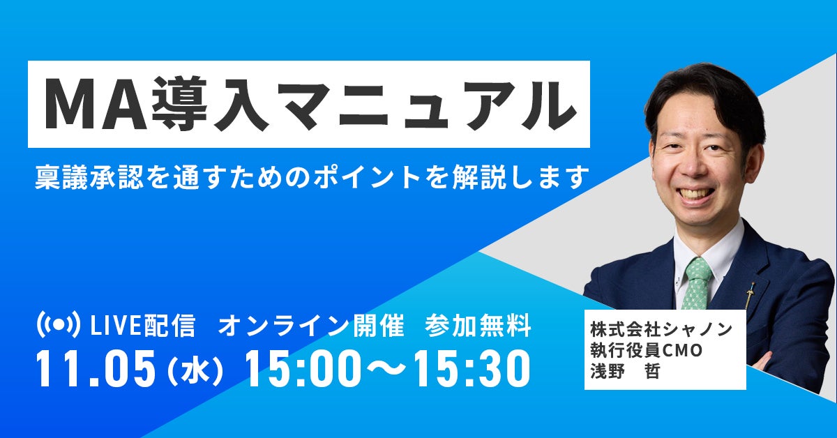 株式会社シャノン(本社:東京都港区、代表取締役CEO:山﨑 浩史)は、11月5日(水) にMA導入・乗り換え時に必要な社内稟議を通すためのポイントをご紹介するセミナーを開催いたします。