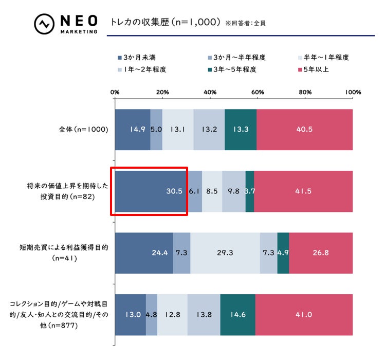 目的別で見ると、特に「将来の価値上昇を期待した投資目的」「コレクション目的/ゲームや対戦目的/友人・知人との交流目的/その他」は収集歴「5年以上」が同じく40%超えに。