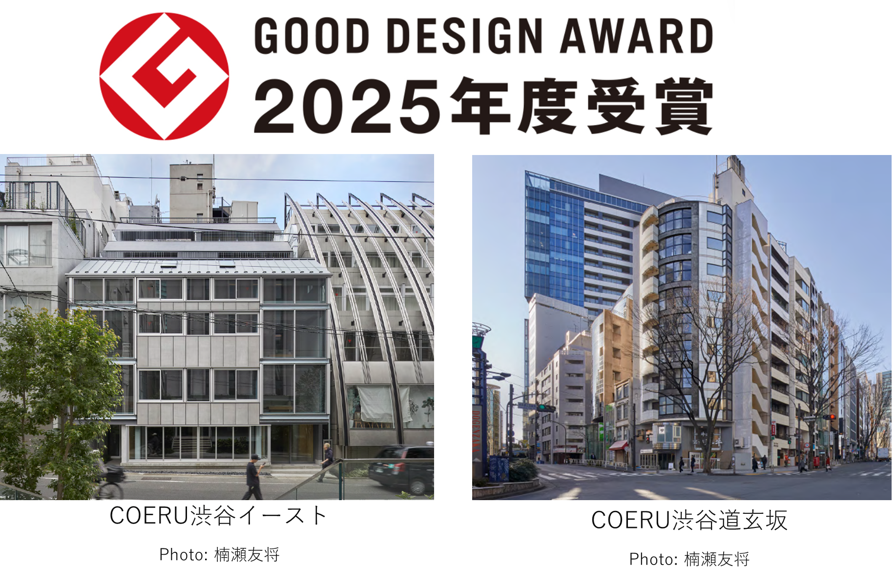 東急不動産株式会社(本社:東京都渋谷区、代表取締役社長:星野 浩明、以下「東急不動産」)、株式会社再生建築研究所(本社:東京都渋谷区、代表取締役:神本 豊秋、以下「再生建築研究所」)は、再生建築の手法を用いた都市型コンパクトビルである「COERU渋谷イースト」「COERU渋谷道玄坂」の2物件が、公益財団法人日本デザイン振興会主催の2025年度グッドデザイン賞を受賞しましたのでお知らせいたします。この受賞は、COERUシリーズにおいて初の受賞となります。