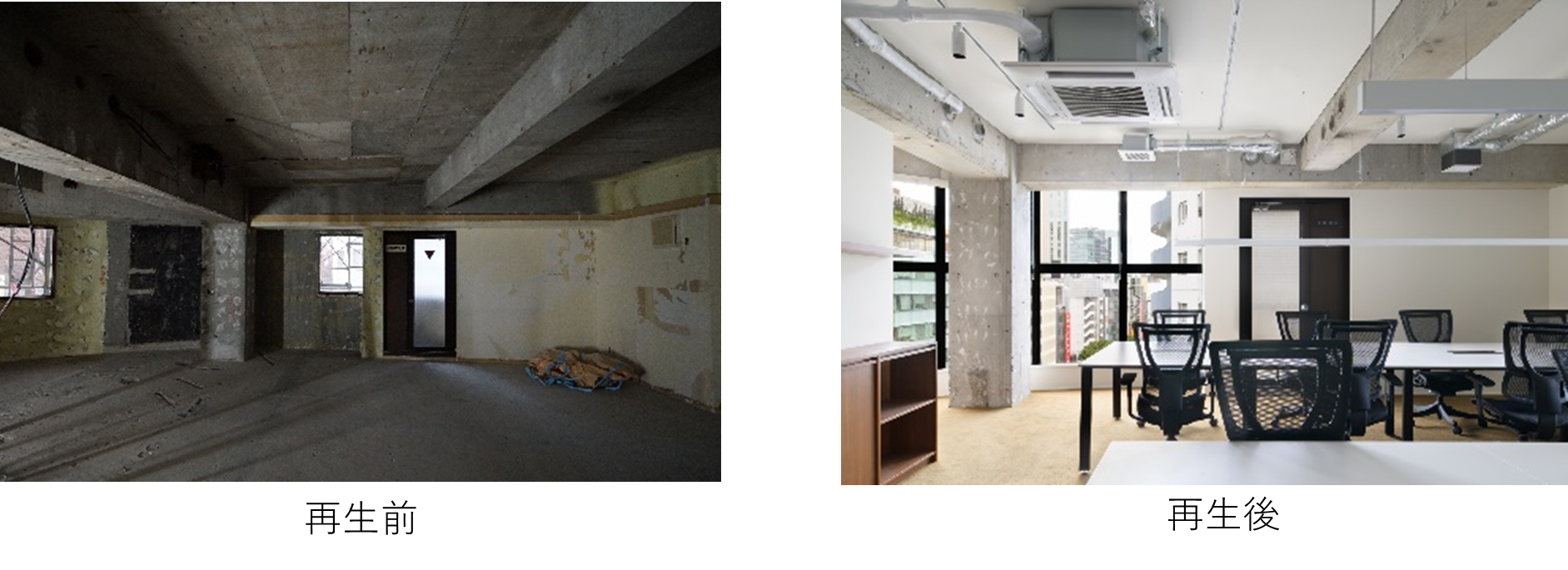 「COERU」は、資材・資源の再生による環境への配慮(環境先進性)、フレキシブルな場の提供(フレキシブル性)、自然や素材を活かした、「再生」を想起させるデザイン(クリエイティビティ)の3点を軸とした、「RE:PLAY NATURE」をコンセプトとした都市型コンパクトビルシリーズです。既存の躯体を活かす再生建築の手法を用いてCOERU渋谷イーストでは増築、COERU渋谷道玄坂では減築を行うなどの変更を経て、新築時と比較しCO2排出量や廃棄物量を大幅に削減しながら、需要に即した設計とし、新築とは異なる不動産価値を生み出しました。