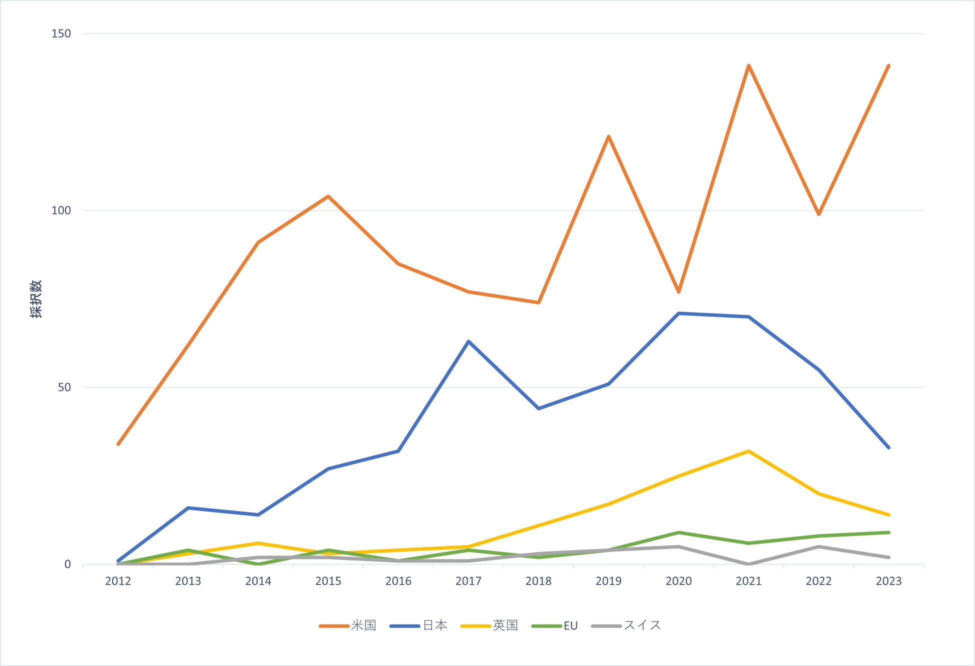 図2は、2012年から2023年の期間で、マテリアルズ・インフォマティクスに関連するグラントプロジェクトの件数が上位5つの国の動向です。ただし、中国はグラントデータを非公開としており、実態を反映していない可能性が高いため除外しました。また、公開直後のグラント情報にはデータベースに格納されていないものもあり、直近の集計値については過小評価されている可能性があります。
