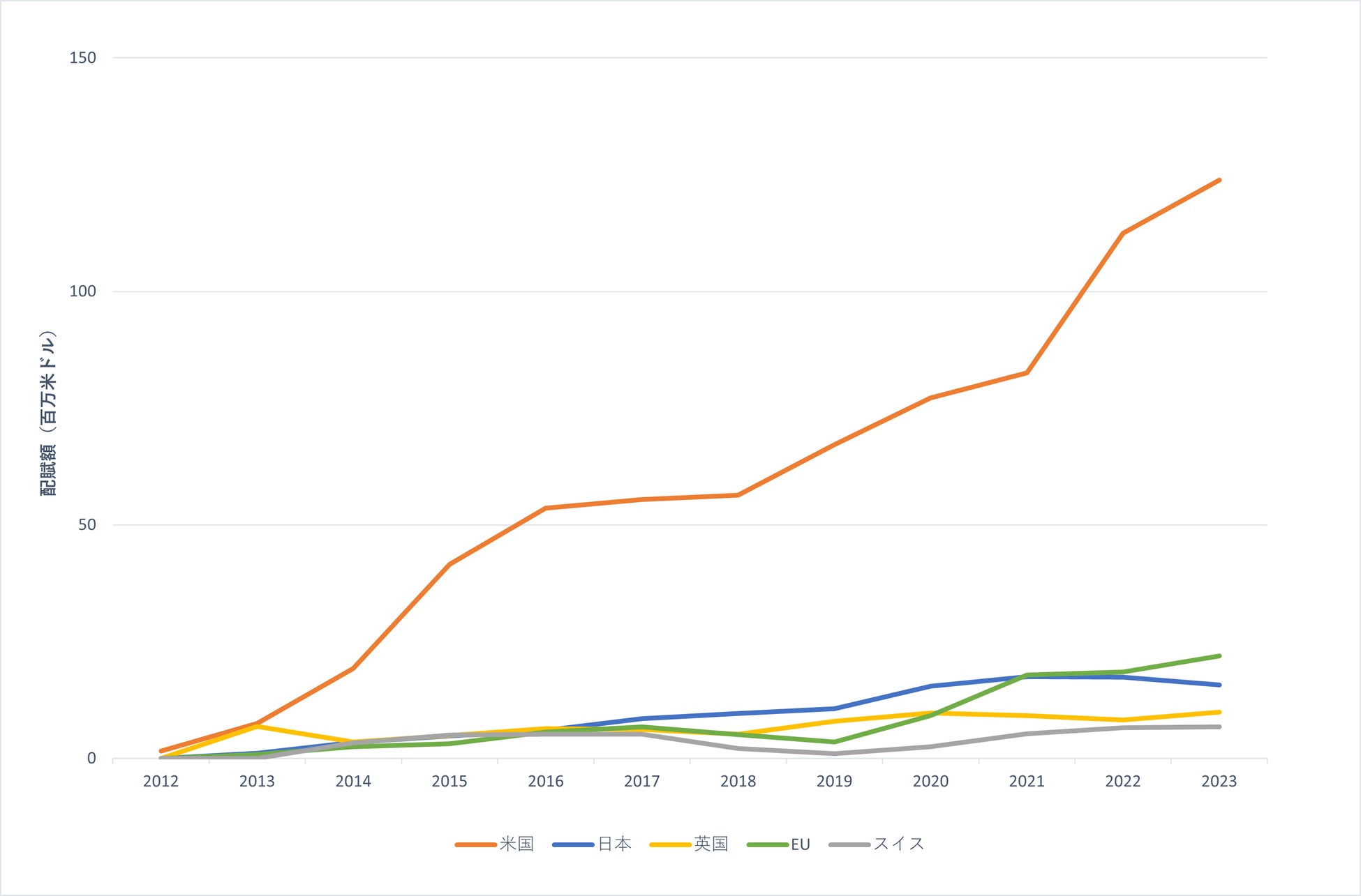 件数および研究配賦額の両方で、米国が1位となっており、特に配賦額では他国を大きく引き離しています。この背景には、米国において早期に政権主導の国家プロジェクトが立ち上がったことがあります。