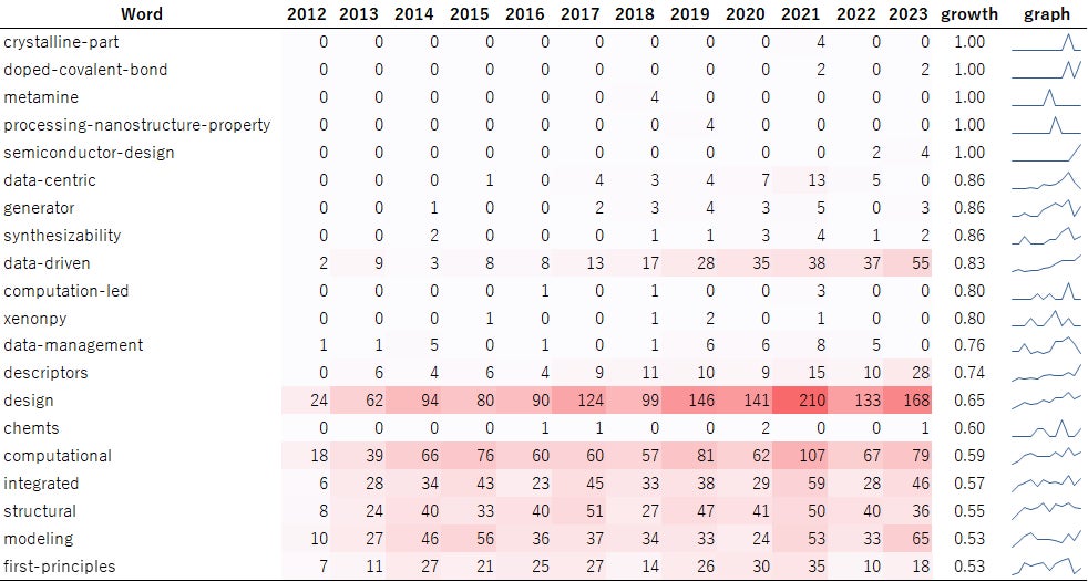 「data-centric」や「data-driven」といった、データ主導での開発を志向する語が成長率の上位に見られます。マテリアルズ・インフォマティクスの基礎的な開発は進んでおり、開発の中心と位置付けられるほどの信頼を得つつあると考えられます。また、絶対数は少ないものの「doped-covalent-bond(ドープした共有結合)」、「semiconductor-design」といった半導体の開発に関連する語も見られ、特定の構造や分野への適用を目指した研究も開始されていることがうかがえます。さらに「metamine」や「xenopy」といったオープンソースの解析ツールに関する語も見られ、研究結果を共有する取り組みが進められていることも伺えます。