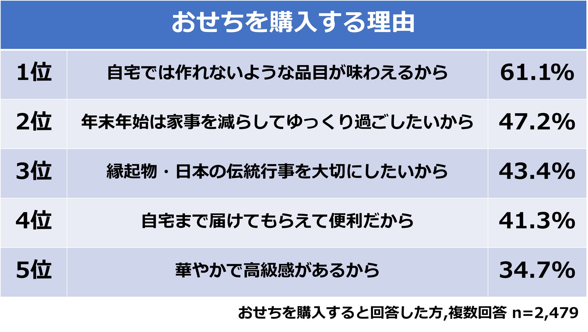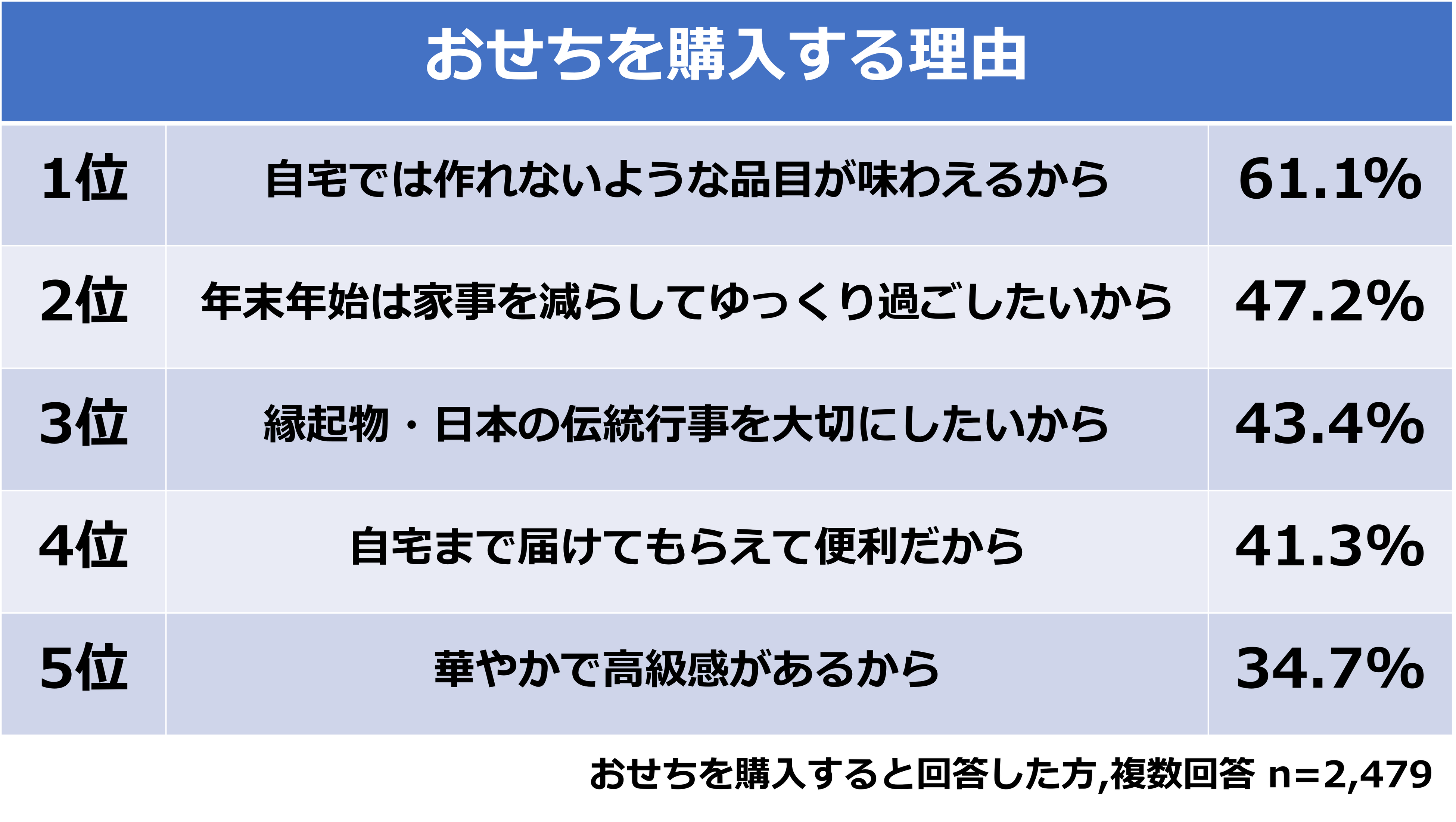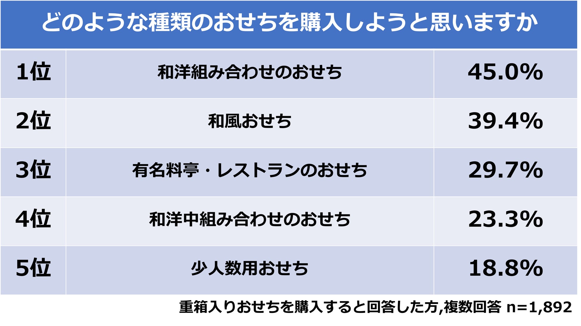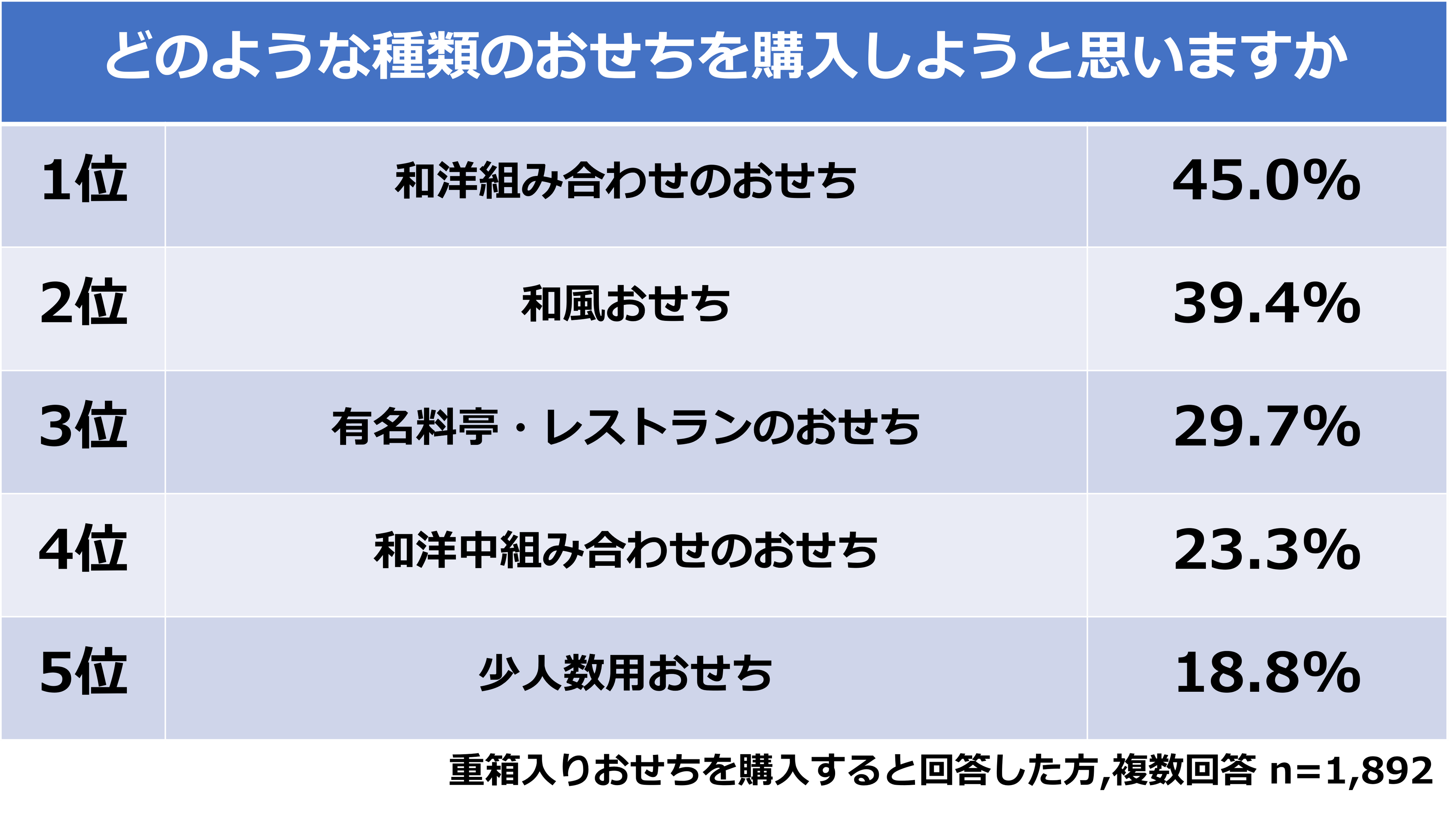 「和風おせち」(39.4%)、「有名料亭・レストランのおせち」(29.7%)という結果となりました。