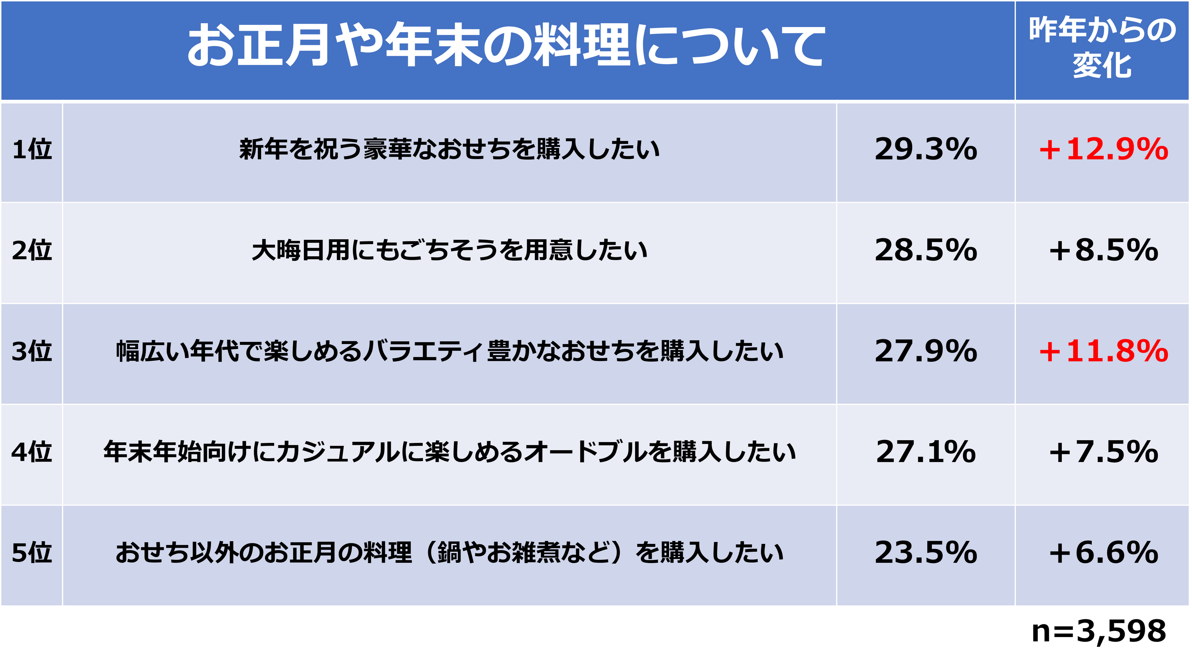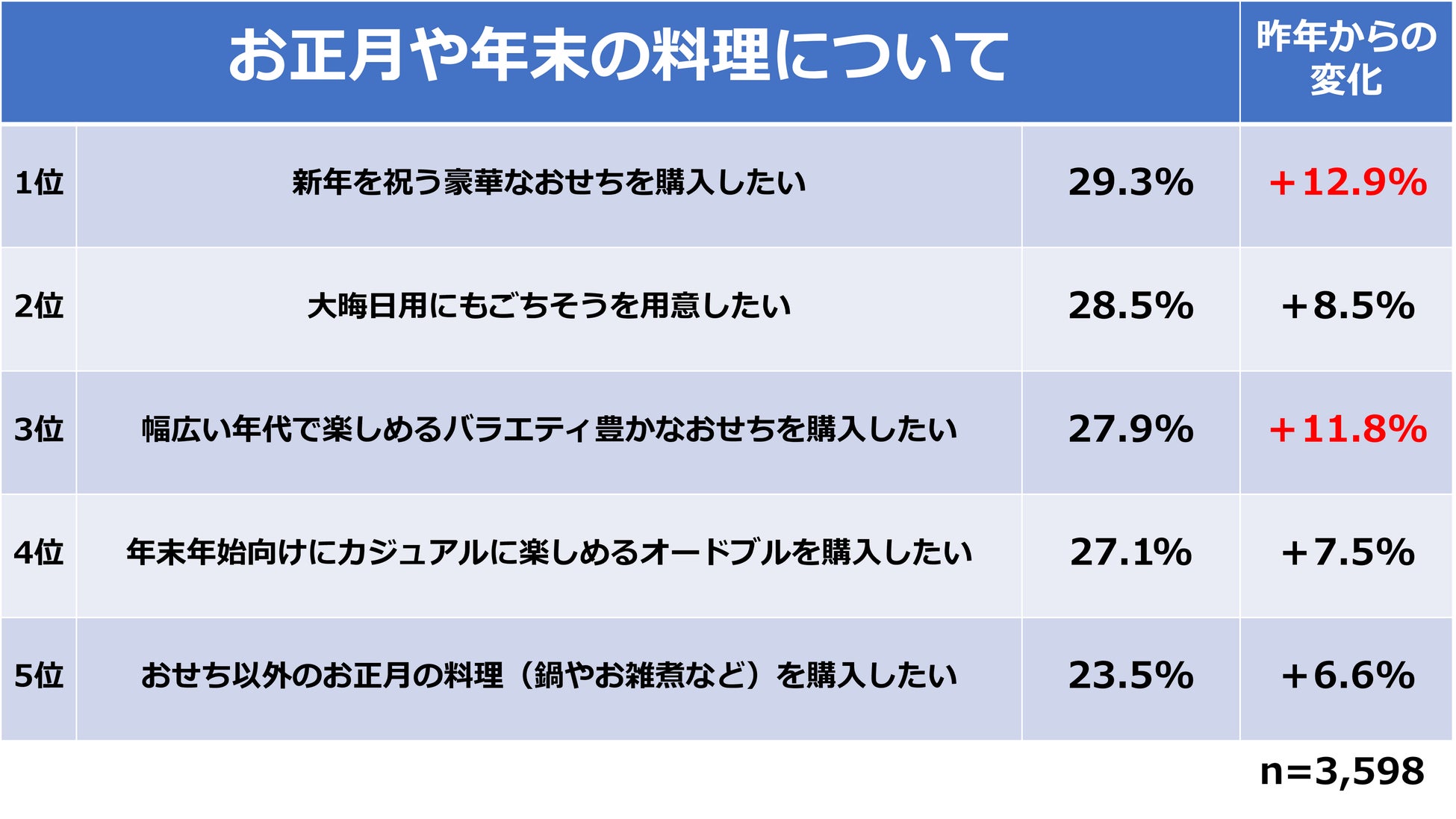 ◆「新年を祝う豪華なおせちを購入したい」(29.3%)、「幅広い年代で楽しめるバラエティ豊かなおせちを購入したい」(27.9%)と回答した方が昨年に比べ10%以上増加。