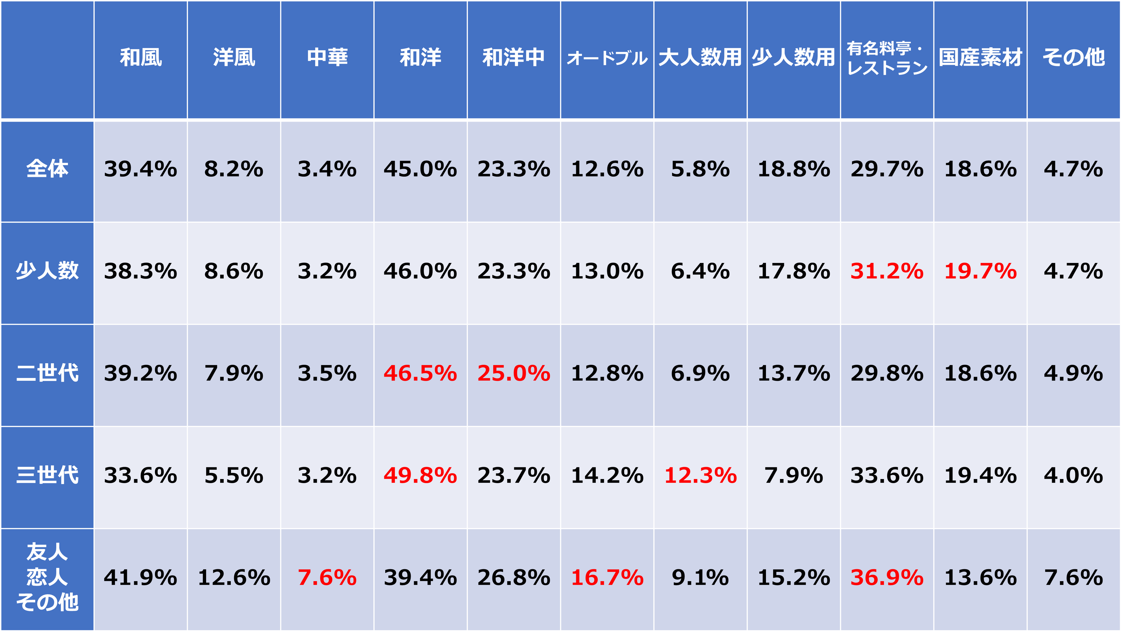 一緒におせちを召し上がる方別で見ると、選ぶおせちの種類に変化がみられました。少人数で召し上がる方(夫婦、一人)には、「料亭・レストランのおせち」や「国産おせち」を好む方が多く、二世代(親子)で召し上がる方にはバラエティ豊かな「組み合わせおせち」に人気が集まりました。三世代(祖父母、孫も一緒)で召し上がる予定の方は、大人数、子供も食べやすい「組み合わせおせち」を選ぶ傾向がみうけられました。また友人と召し上がる予定の方には、「料亭のおせち」、「中華おせち」、「オードブルおせち」のニーズが比較的高い傾向がありました。