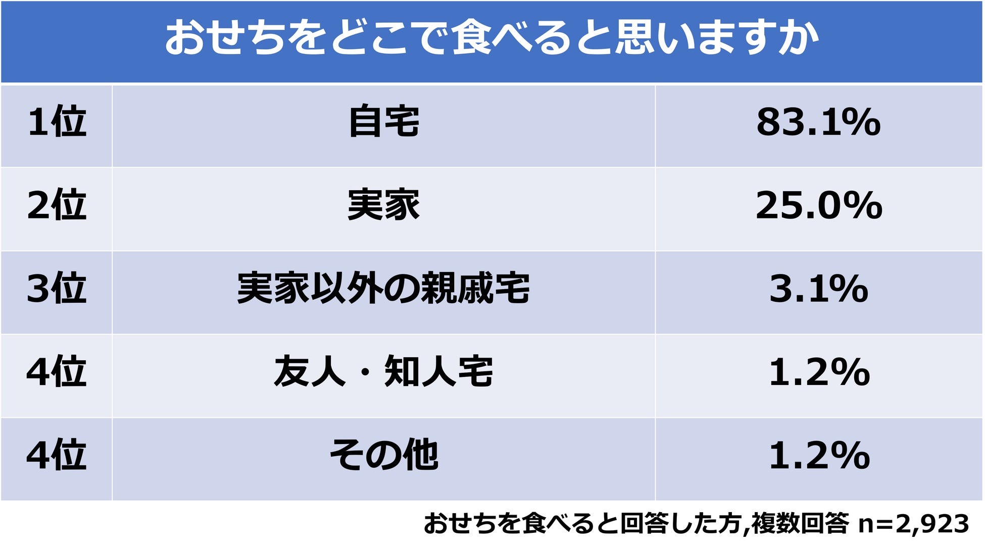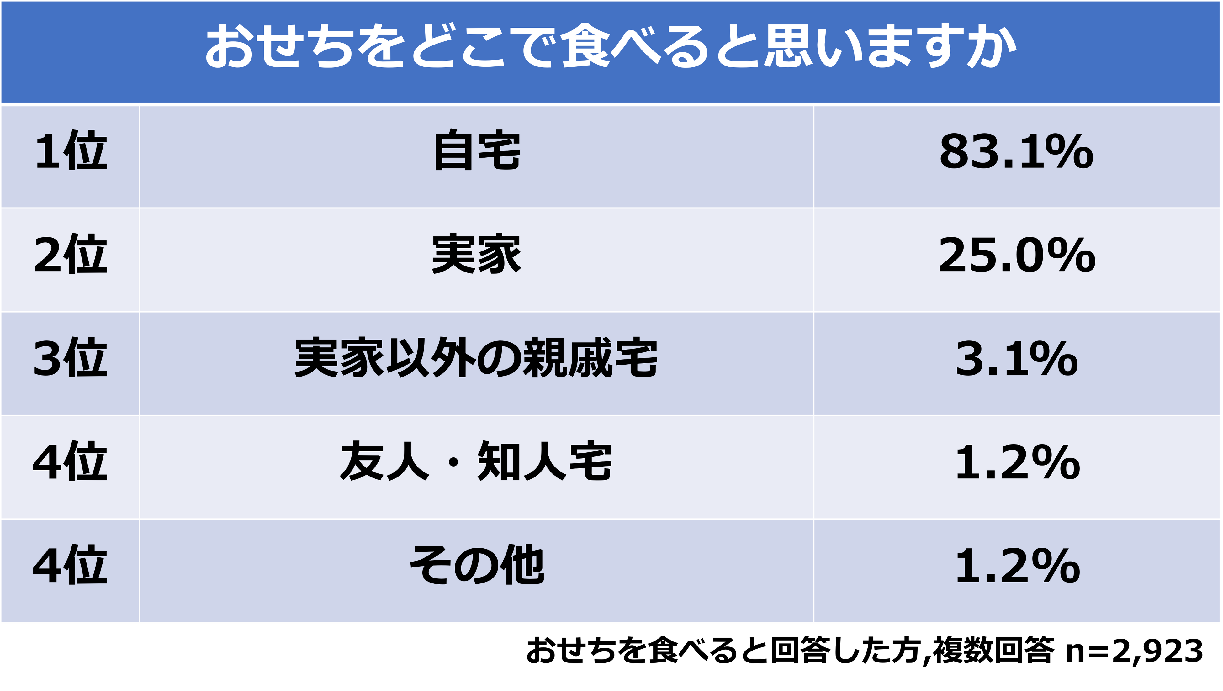 「来年のお正月におせち料理を食べると思いますか」という質問に対して81.2%が「食べると思う」と回答しました。またおせちを食べる予定の方に食べる場所を聞いたところ、「自宅」と答えた方が最も多く83.1%、次いで「実家」が25.0%、「実家以外の親戚宅」が3.1%という結果になりました。お正月は家族が集まり食卓を囲む、日本の伝統・風物詩であることが改めて示された形です。