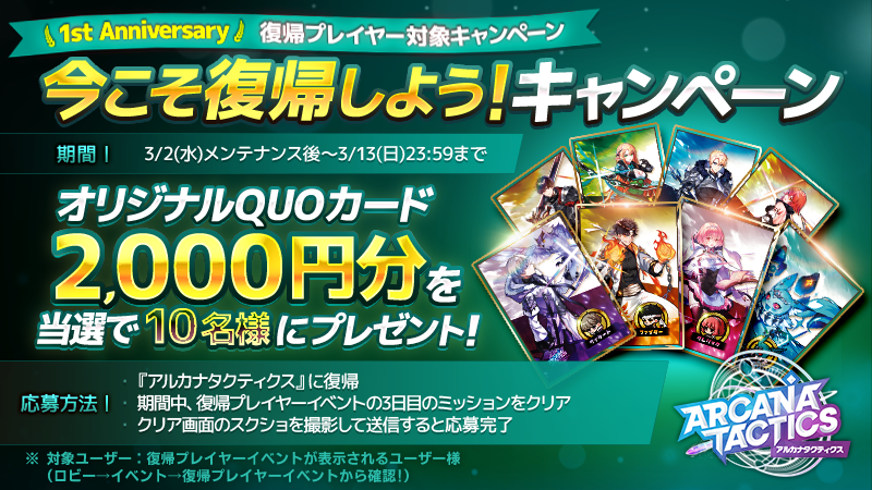 復帰プレイヤーイベントの3日目のミッションをクリアした画面をスクリーンショットして、専用フォームから応募すると、応募者の中から抽選で10名様に「オリジナルQUOカード2,000円分」があたるキャンペーンも同時に開催中!