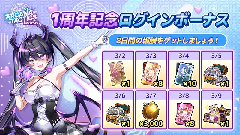 おかげさまで、アルカナタクティクスは2022年3月9日(水)に1周年を迎えます。これに先立ち、2022年3月2日(水)に1周年記念アップデートを実施いたしました。欲しいメジャーアルカナが獲得できるなど、豪華イベントが盛りだくさんとなっておりますので、ぜひ、この機会をお見逃しなく!