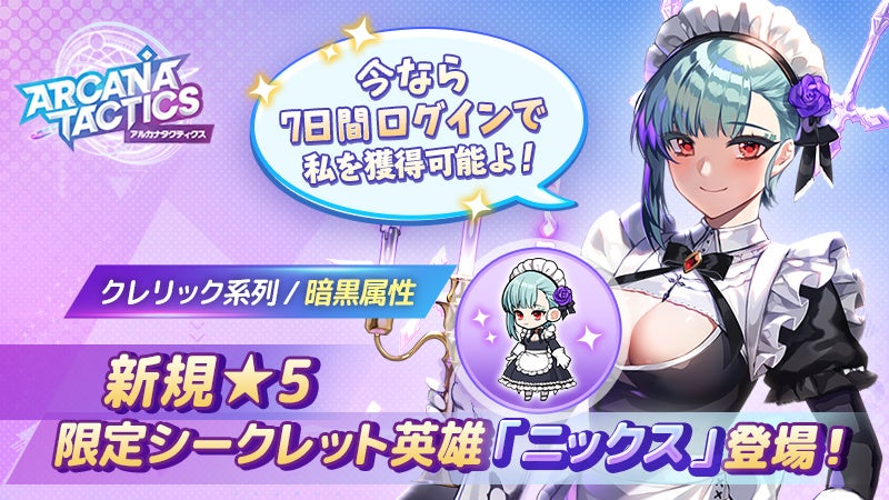 クレリック系列の暗黒属性、星5限定シークレット英雄「ニックス」が登場しました。これにともない、「ニックススペシャルステージ」がオープンしました。「ニックススペシャルステージ」をクリアすると、クリア報酬として異界の破片を獲得でき、異界のショップでニックスの霊魂石など、様々な豪華アイテムと交換できます。