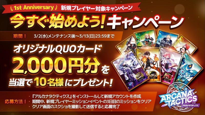 新規プレイヤーイベントの3日目のミッションをクリアした画面をスクリーンショットして、専用フォームから応募すると、応募者の中から抽選で10名様に「オリジナルQUOカード2,000円分」があたるキャンペーンも同時に開催中!