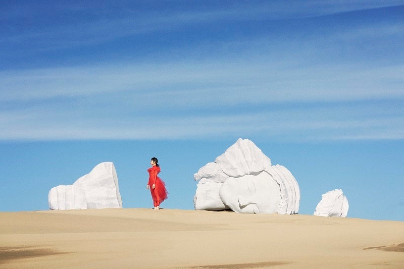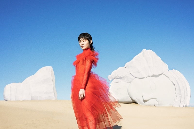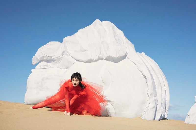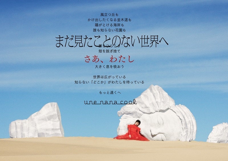 また、「見たことのない世界」を表現するために“脱ぎ捨てられた自分の殻”をイメージした大道具を設置し、その前に「一歩踏み出す」・「さあ、わたし」というキーワードにぴったりな、新たなステージへ踏み出したばかりであるコムアイさんに立って貰うことで、「一歩踏み出したい」女の子の背中を押すようなメッセージが込められたクリエイティブに仕上げました。