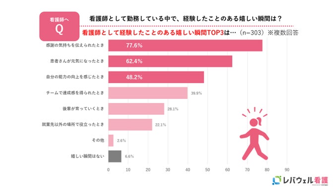 看護師が勤務している中で、経験したことのある嬉しい瞬間第1位は「感謝の気持ちを伝えられたとき」が最も多く77.6%
