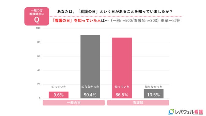 5月12日「看護の日」という存在を「知っている」と答えた人が、一般生活者向け調査では9.6%、看護師向け調査では86.5%の結果となり、大きな差があることが判明