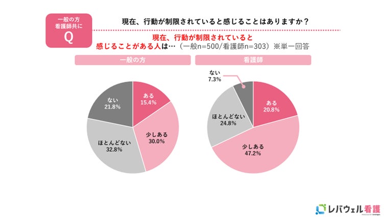 コロナ禍において「現在、行動が制限されていると感じることがあるか」という質問に対して、一般生活者と比較し、看護師はより行動制限を感じているという結果に