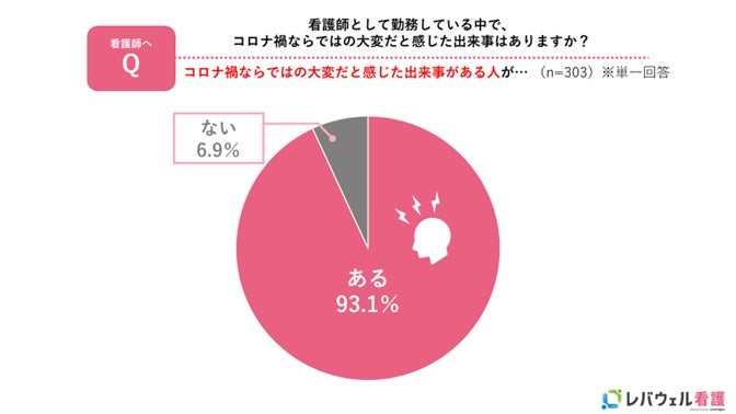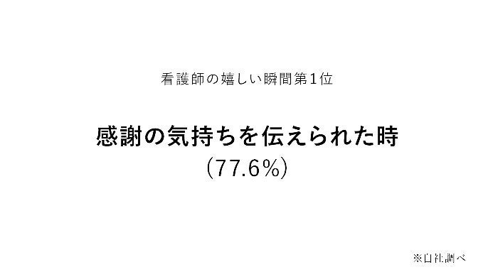 2. 看護師向けの調査では「看護師として勤務している中で、コロナ禍ならではの大変だと感じた出来事はありますか」という質問に対し、93.1%の人が「ある」と答え、「仕事上だけでなく、プライベートの行動制限」「コロナ禍で感染など不安もあったが休むことができなかった」「検査や発熱時の対応、隔離対応など業務が増えた」などの回答が見られました。また「看護師として勤務している中で、経験したことのある嬉しい瞬間」については「感謝の気持ちを伝えられたとき」が一番多く77.6%を占める結果となり、コロナ禍ならではの大変なことがある一方で、働く中で嬉しい瞬間もあるということが分かりました。
