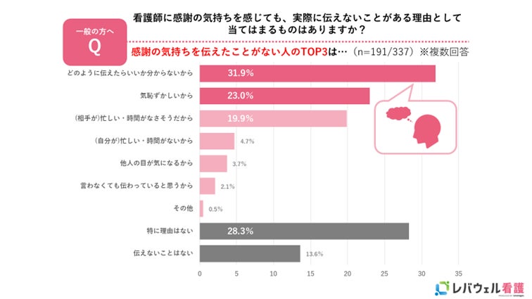 一般生活者の中で看護師に対して感謝の気持ちを感じている人々は多く、看護師の嬉しい瞬間は「人々から感謝の気持ちを伝えられたとき」であることが伺えます。レバウェル看護は本プロジェクトにより、多くの方々が看護師へ感謝を伝えるお手伝いをし、看護の現場で働く方々に感謝の気持ちをお届けいたします。