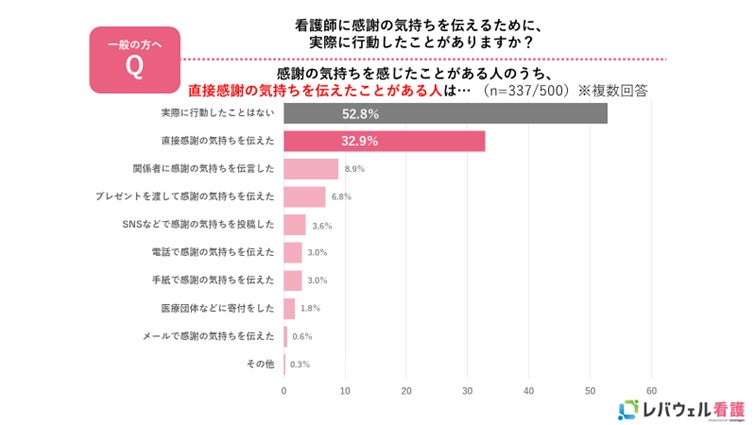 これまで看護師に感謝の気持ちを感じたことがある人が約7割にのぼる一方、その中で52.8%の人が「感謝を伝えるために行動に移したことはない」と回答