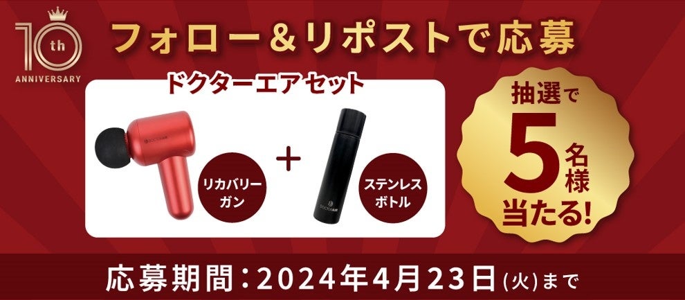 さらに、今回の大感謝祭の開催を記念して、ドクターエア公式Xアカウント、Instagramアカウントにてプレゼントキャンペーンを実施いたします。大人気の【リカバリーガン】と『ドクターエア』のロゴが入った特製ステンレスボトルをセットで5名の方にプレゼントいたします。ぜひこちらのキャンペーンもあわせてご覧ください。