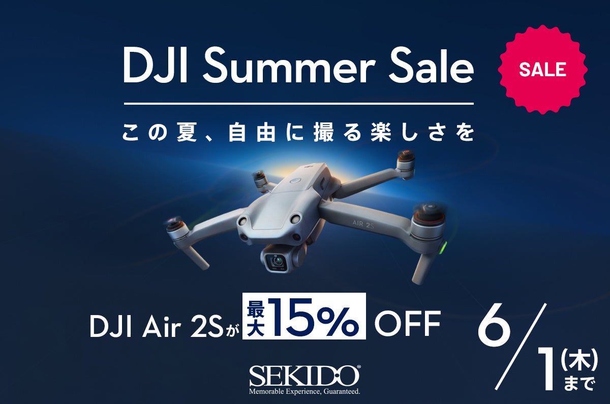 日本初のDJI正規販売代理店である株式会社セキド(本社:東京都港区、代表取締役:大下貴之)では、2023年5月19日(金)より、性能と価格のベストバランスを実現した人気ドローン「DJI AIR 2S(ディージェーアイ エアー ツーエス)」が 15%OFFとなる「DJI Summer Sale」を開催いたします。携帯性も良く安定感のある 595gの機体に1インチCMOSセンサーを搭載した DJI Air 2Sは、動画解像度 5.4K/30fpsを実現し、映画のような映像を自動飛行で撮影したり、4方向の障害物センサーで安全なフライトを実現するなど、すべてのドローンユーザーにおすすめの一台です。はじめてのドローンでも安心のプロが選んだお得なセキドオリジナルセットが対象の本セールは6月1日(木)までの期間限定です。