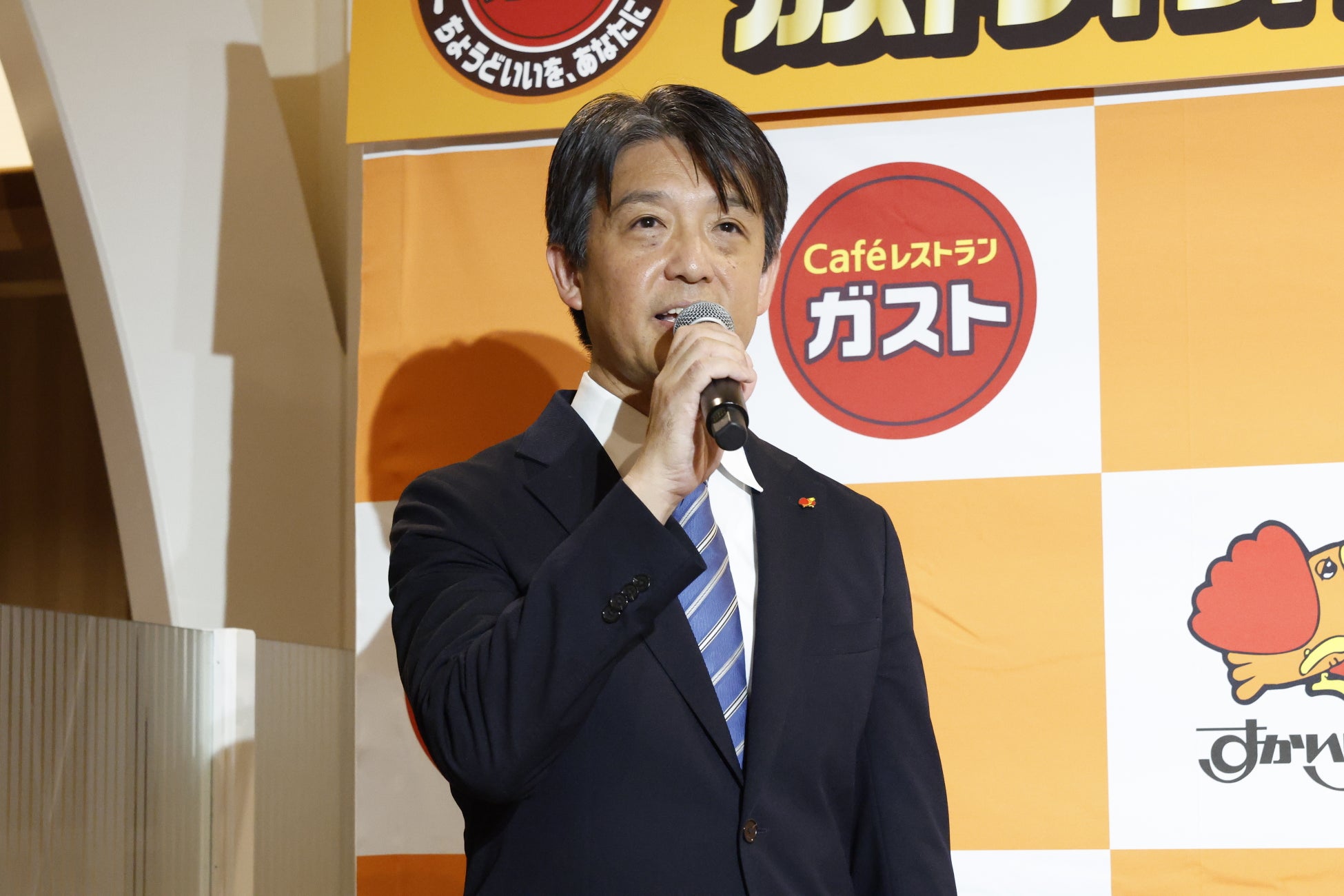 発表会冒頭では、すかいらーくホールディングス取締役 平野氏より、「2月より掲げているガストのブランドタグラインである“ちょうどいいを、あなたに”を象徴するメニューとして導入したガストフィットメニューが好評につき、『ガストフィットメニュー2』としてパワーアップして再登場することになりました。」と発表しました。