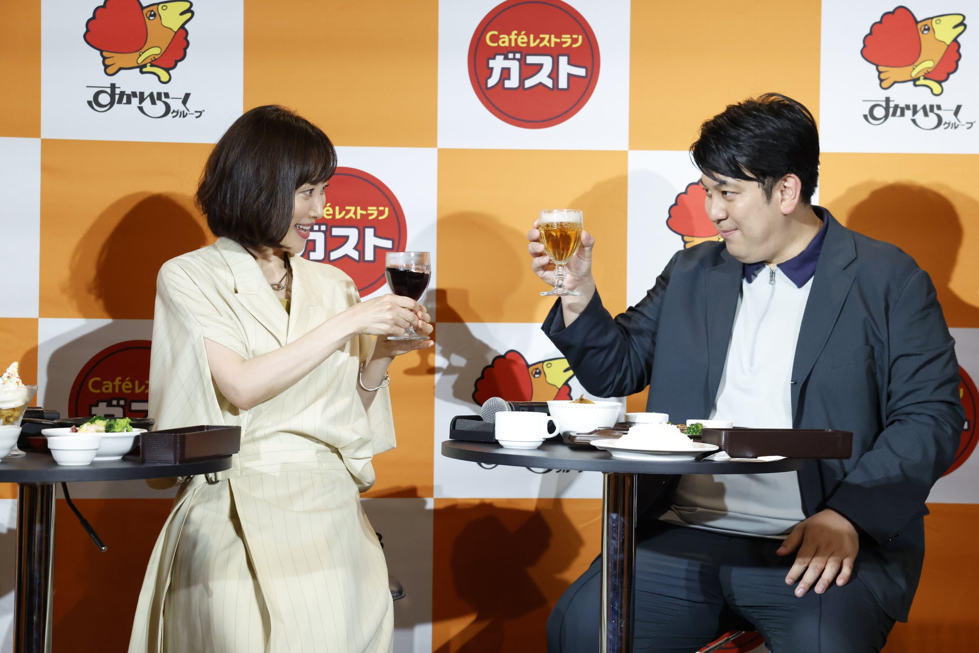続いて、3児のママでタレントの山口もえさんと、日頃からガストを愛用しているジャンボたかおさんにお越しいただき、「お米の価格が高止まりの状況を見せ、物価高の中、生活者の皆様に、お財布に優しく、楽しく外食を味わってもらいたい」と「ガストフィットメニュー2」発表の経緯を語りました。