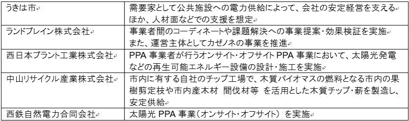 一般社団法人うきは観光みらいづくり公社、うきはの里株式会社、うきは市商工会、ランドブレイン株式会社、西鉄自然電力合同会社、西日本プラント工業株式会社、中山リサイクル産業株式会社、九州電力株式会社福岡支店、JFEエンジニアリング株式会社、自然電力株式会社