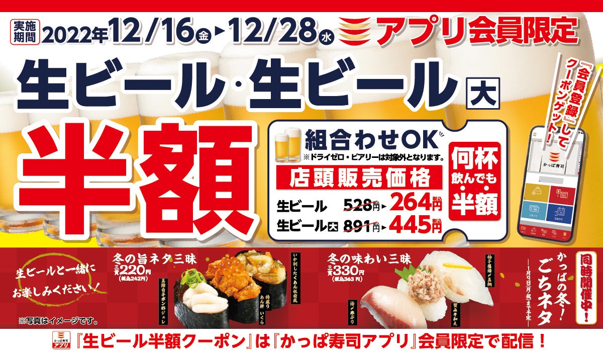 【かっぱ寿司アプリ会員限定】2022年のご愛顧に感謝を込めて 何杯飲んでも生ビール半額キャンペーン!