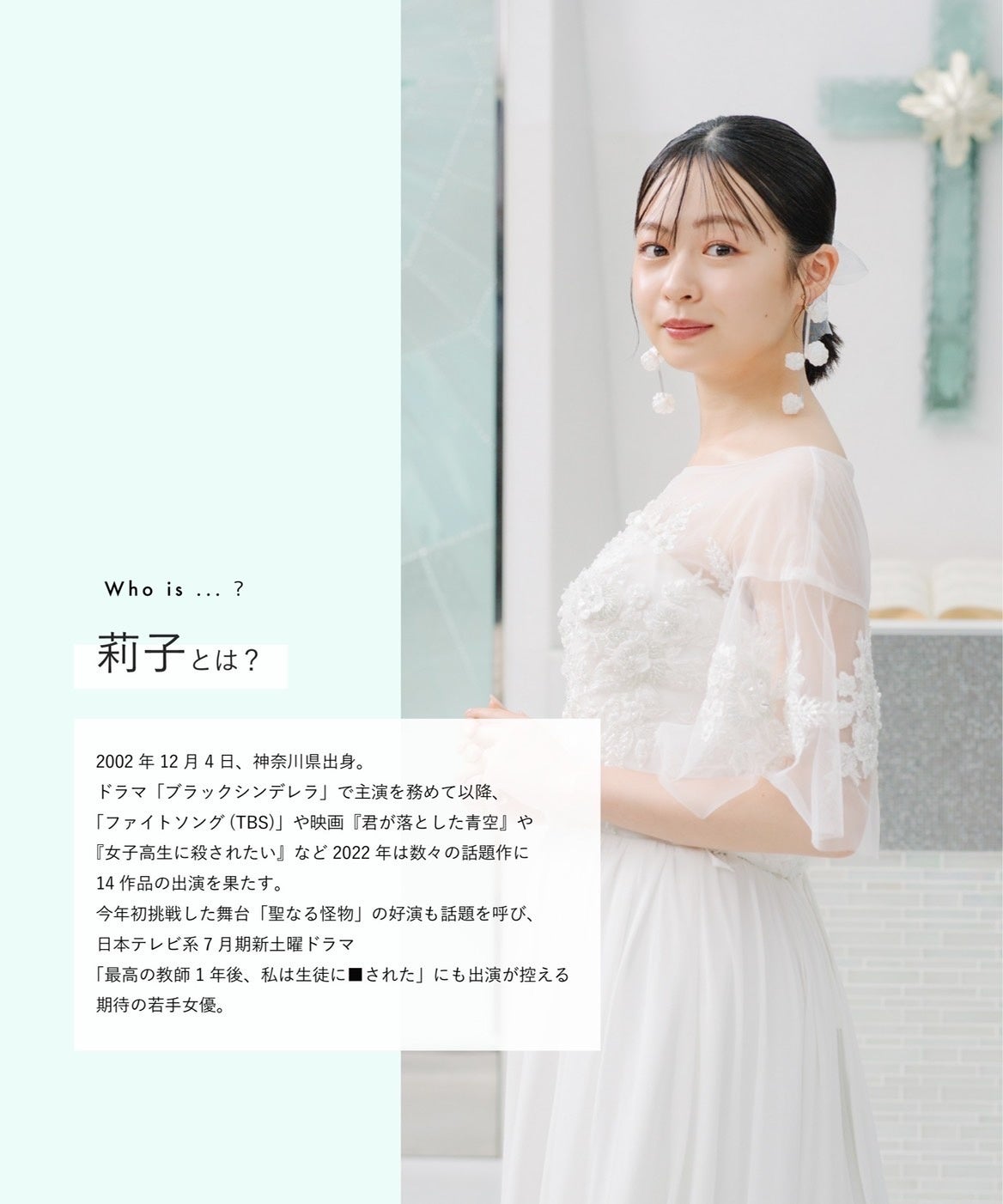 ドラマ「ブラックシンデレラ」で主演を務めて以降、「ファイトソング(TBS)」や映画『君が落とした青空』や『女子高生に殺されたい』など2022年は数々の話題作に14作品の出演を果たす。今年初挑戦した舞台「聖なる怪物」の好演も話題を呼び、日本テレビ系7月期新土曜ドラマ「最高の教師 1年後、私は生徒に■された」にも出演が控える期待の若手女優。
