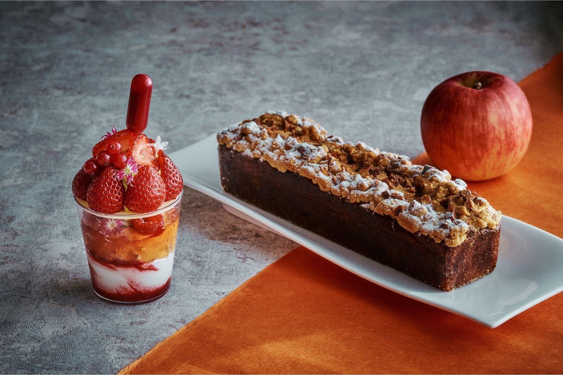 (右)キャラメル風味の生地に青森県産のりんごを合わせた、食感も楽しいパウンドケーキ。