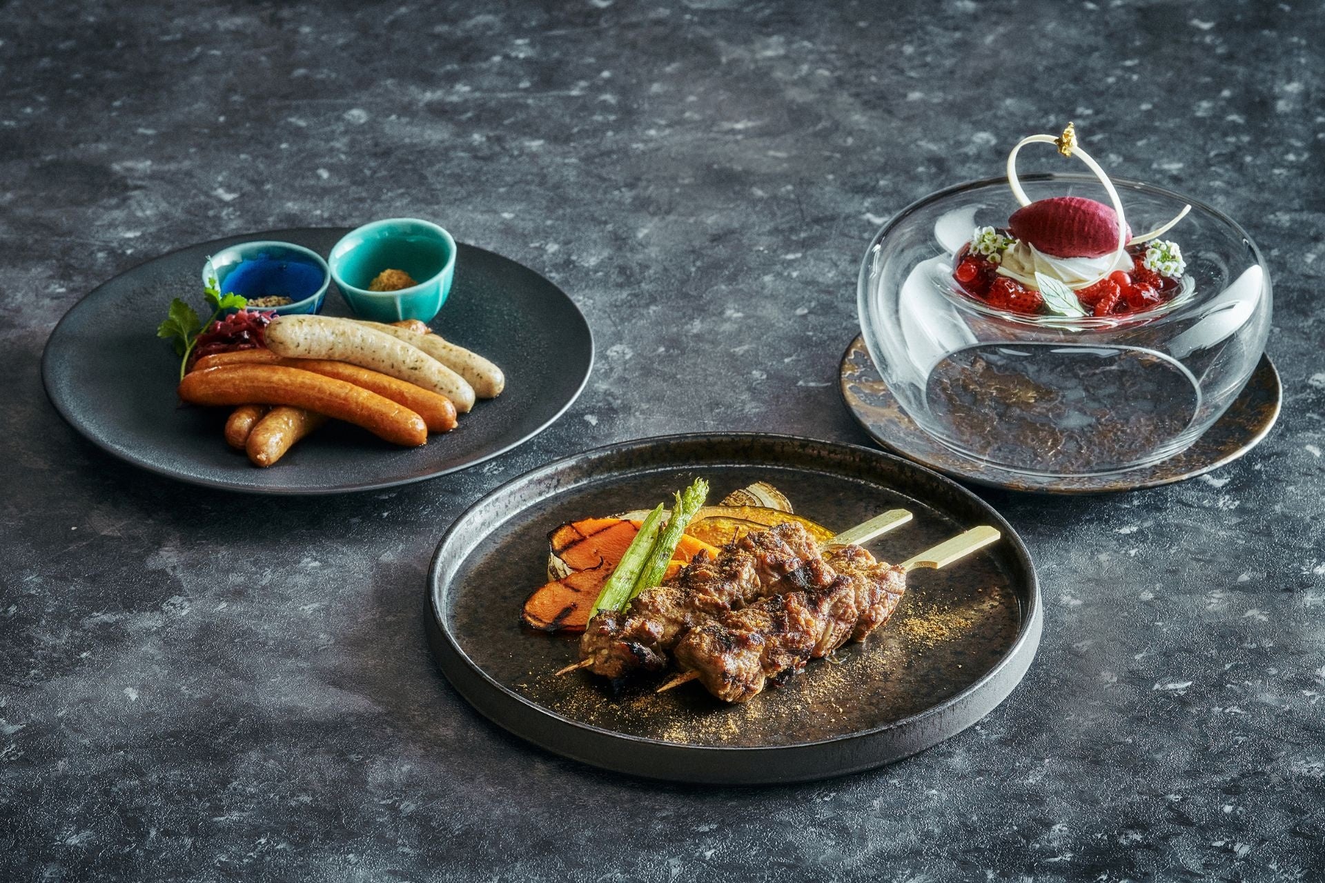 (左)「函館カール・レイモン」のレイモンヴルスト・レモン&パセリ・チョリソーの3種の味わいを、素材を引き立てるタレに絡めてお召しあがりください。