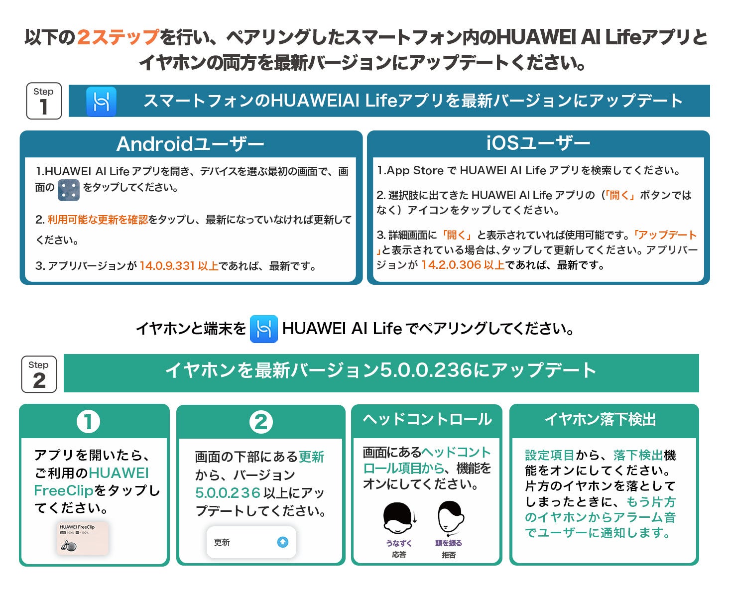 また、このたび①頷いたり頭を左右に振ることで、手を使わず、着信の応答や拒否ができる「ヘッドモーション・コントロール機能」と、②イヤホンが地面に落下した際に、装着中のもう片方のイヤホンが音でお知らせする「イヤホン落下検出機能」という、2つの新機能が追加されました。現在『HUAWEI FreeClip』をご使用の場合、新機能ご利用には、スマートフォンアプリ「HUAWEI AI Life」を最新までアップデートした上で、イヤホンのデバイスバージョンを最新までアップデートいただく必要があります。現在ご使用中の『HUAWEI FreeClip』には、すでに1月中旬より順次アップデート通知が開始されており、1月中にはすべてのお客様の『HUAWEI FreeClip』がソフトウェアアップデート可能となります。アップデートの仕方について詳細は下記をご覧ください。