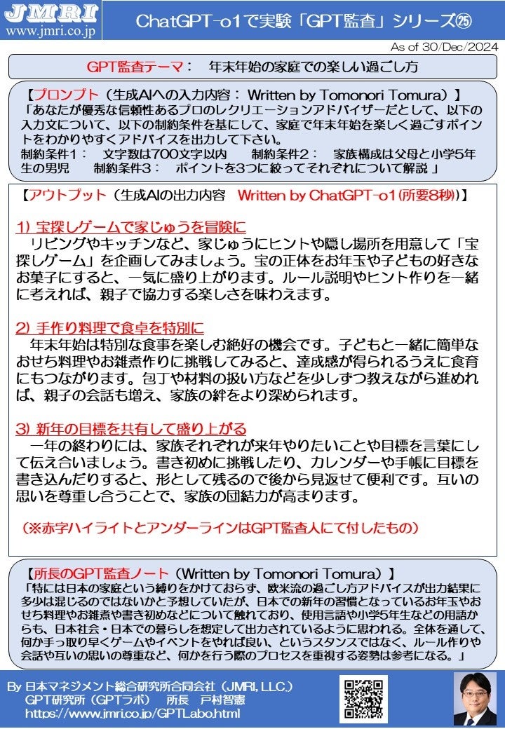 ChatGPT「o1」厳選アドバイス3選:年末年始の家庭での楽しい過ごし方3つのポイント(GPT監査レポート第25号 by GPT監査人 戸村智憲)【日本マネジメント総合研究所合同会社】