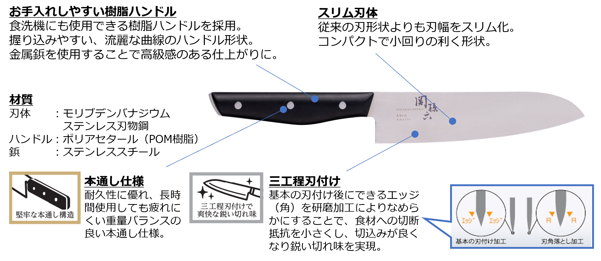 今回新発売となる関孫六「あまいろ」は従来の関孫六の持つ切れ味や耐久性に加え、樹脂ハンドルを採用することで食洗機にも対応し、お手入れがしやすくなりました。握りやすく流麗な曲線のハンドル形状、サテン仕上げを施した刃体など本格的な仕様と優美な造形が融合したシリーズです。三工程刃付けを採用し、食材の切断抵抗を小さくすることで鋭い切れ味を再現しています。