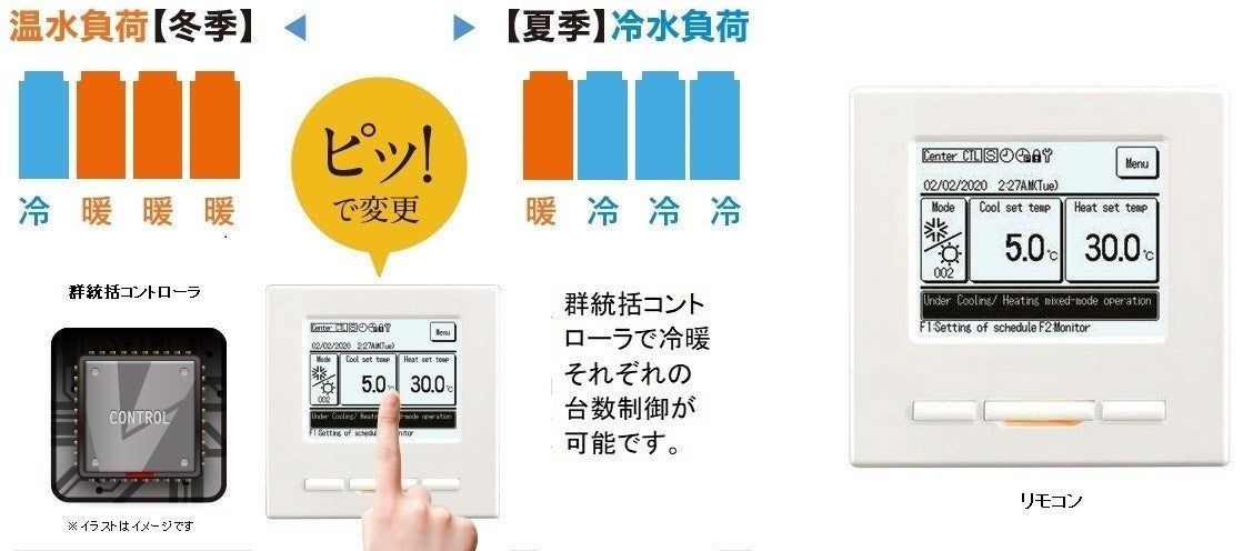 「Hydrolution PRO」シリーズに搭載する「e-3Dスクロール」圧縮機は、縦横両方から三次元に圧縮することで一般的なスクロール圧縮機に比べコンパクトな圧縮構造を取ることが可能で、機械損失の低減に繋がり、低負荷時の効率を飛躍的に高めています。また、圧縮機と水ポンプをインバータ制御することにより、負荷に応じて最適な運転制御を実現します。リモコンは、直感的なタッチ操作により、1台で最大20台までの空冷ヒートポンプチラーの設定・調整が可能です。内蔵されたカレンダー機能で冷暖の台数振り分けを変更できる冷暖混在制御により、運用時期や負荷に応じた最適な運転スケジュールを作成できます。さらに、新開発の群統括コントローラを使用することで、機器負荷に応じた台数制御や最適な運転制御を行うことが可能です。また、本機はModbus®通信を標準搭載しており、上位監視制御装置と簡単接続しエネルギーの見える化が可能です。