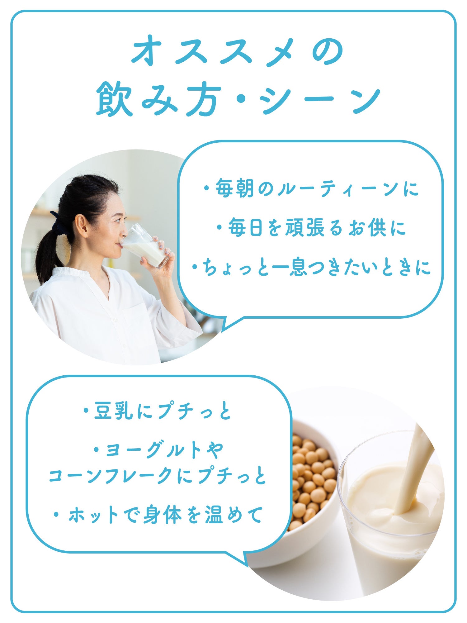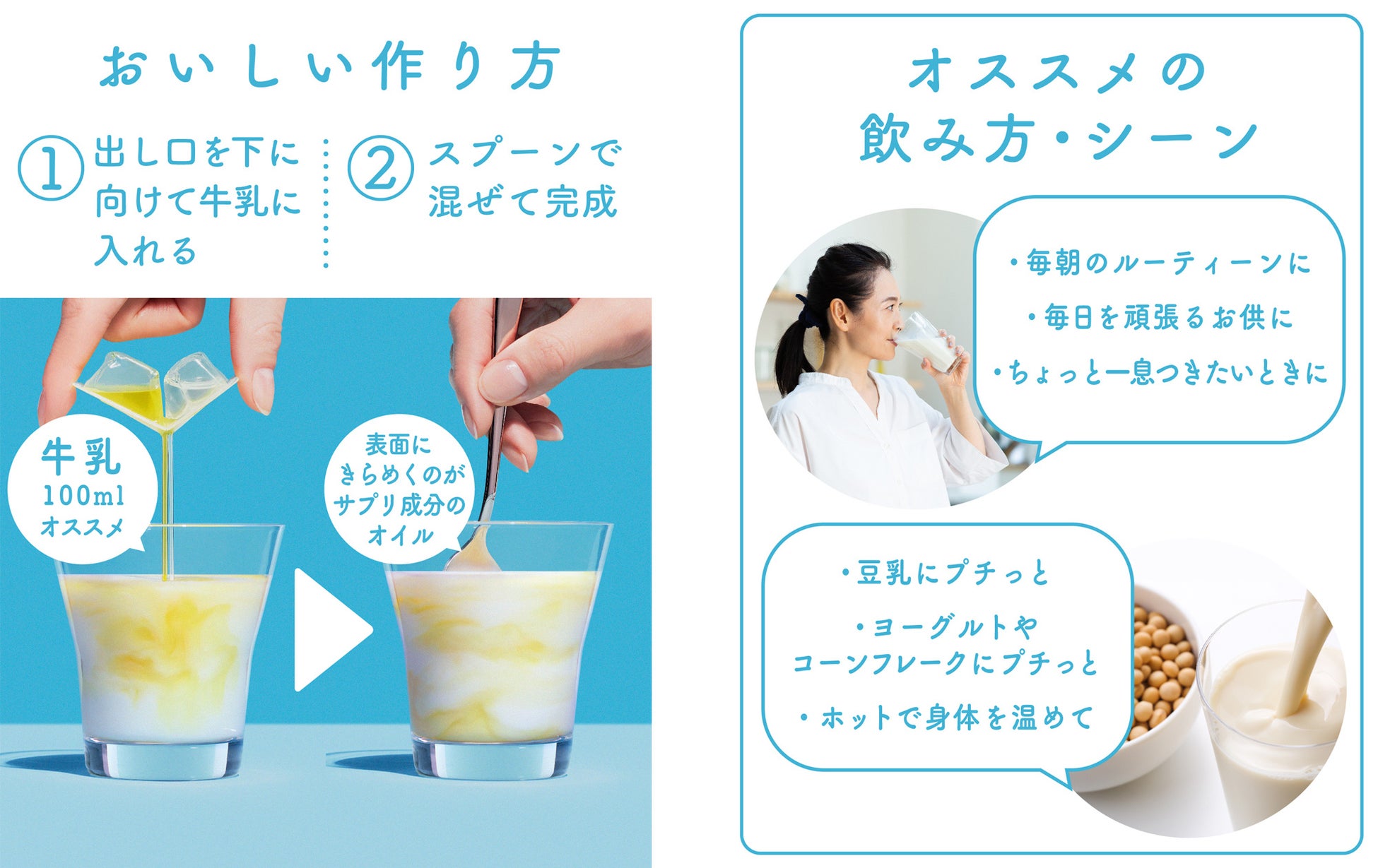 いつものミルクに“ぷちっ”と混ぜるだけで、からだにうれしい“栄養”を、手軽に摂れるおいしいラテをお楽しみいただけます。