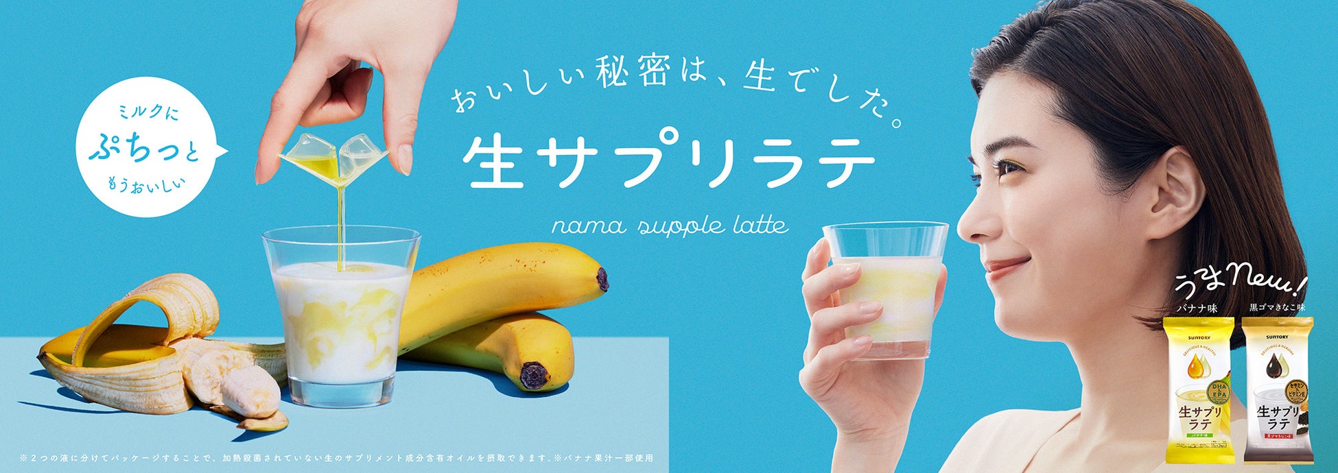 サントリー食品インターナショナル(株)は、からだにうれしい“栄養のもと”を「生」※1のまま摂れる新しいサプリ「生サプリラテ(DHA&EPA バナナ味)」「同(セサミン&ビタミンE 黒ゴマきなこ味)」を開発し、2023年7月4日(火)よりECサイト(Amazon、サントリーウエルネス)で販売開始します。
