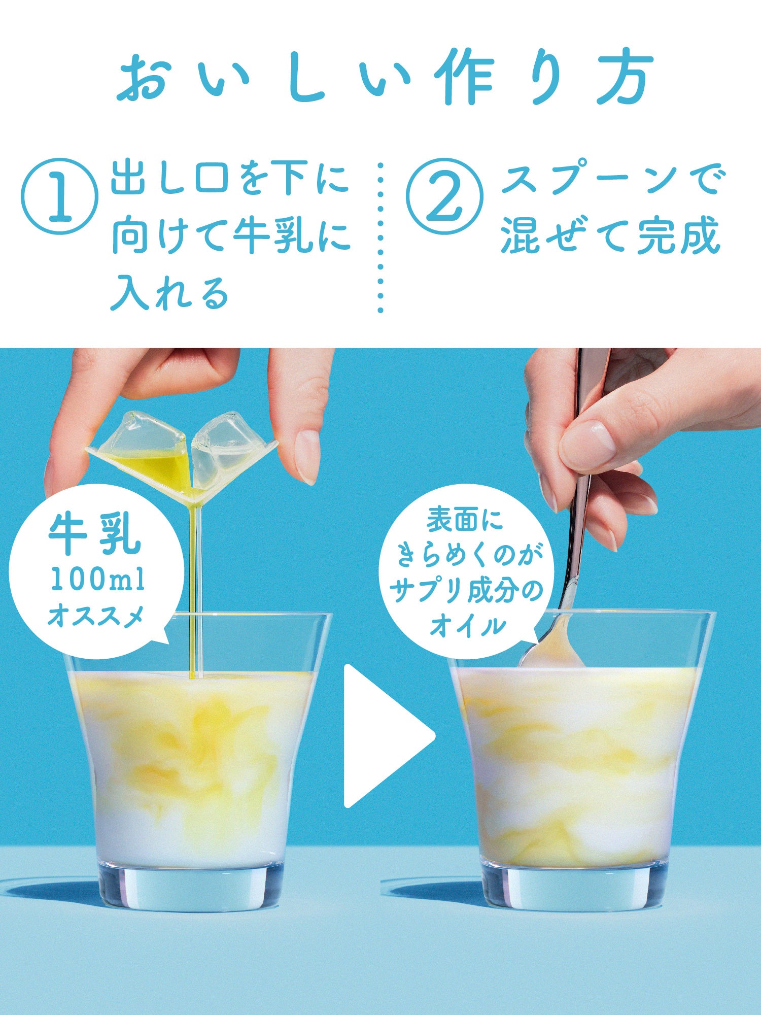 ※1 「生」とは、2つの液に分けてパッケージすることで、加熱殺菌されていない生のサプリメント成分含有オイルを摂取できることを指します。