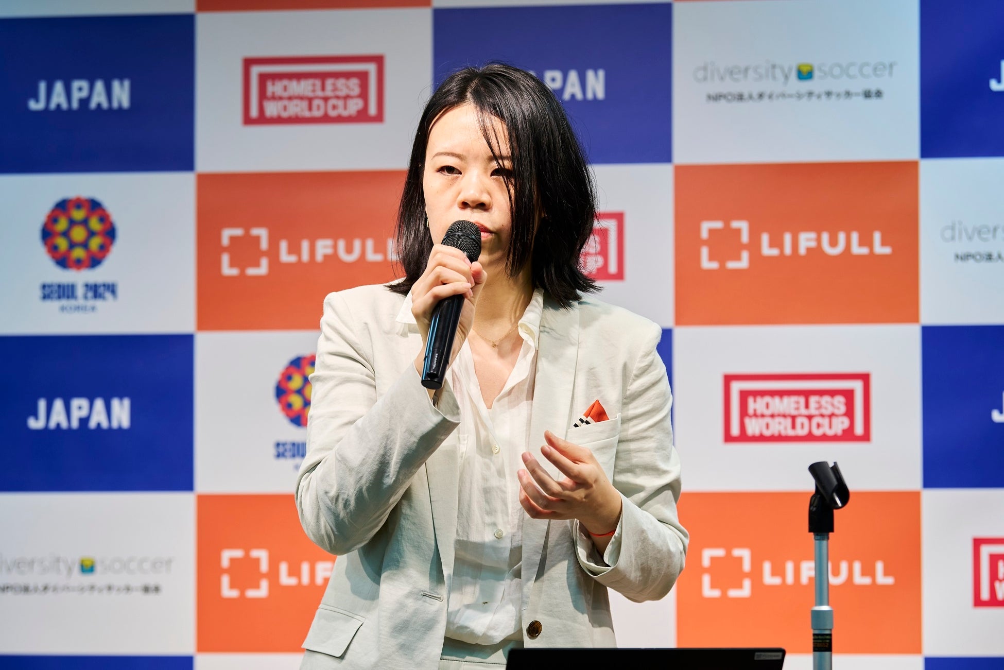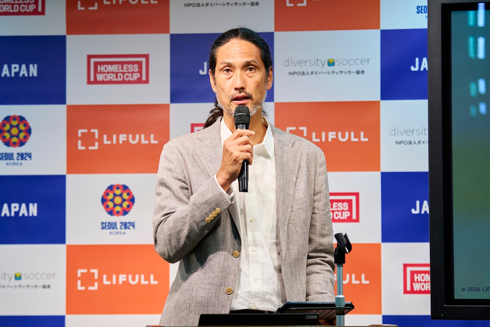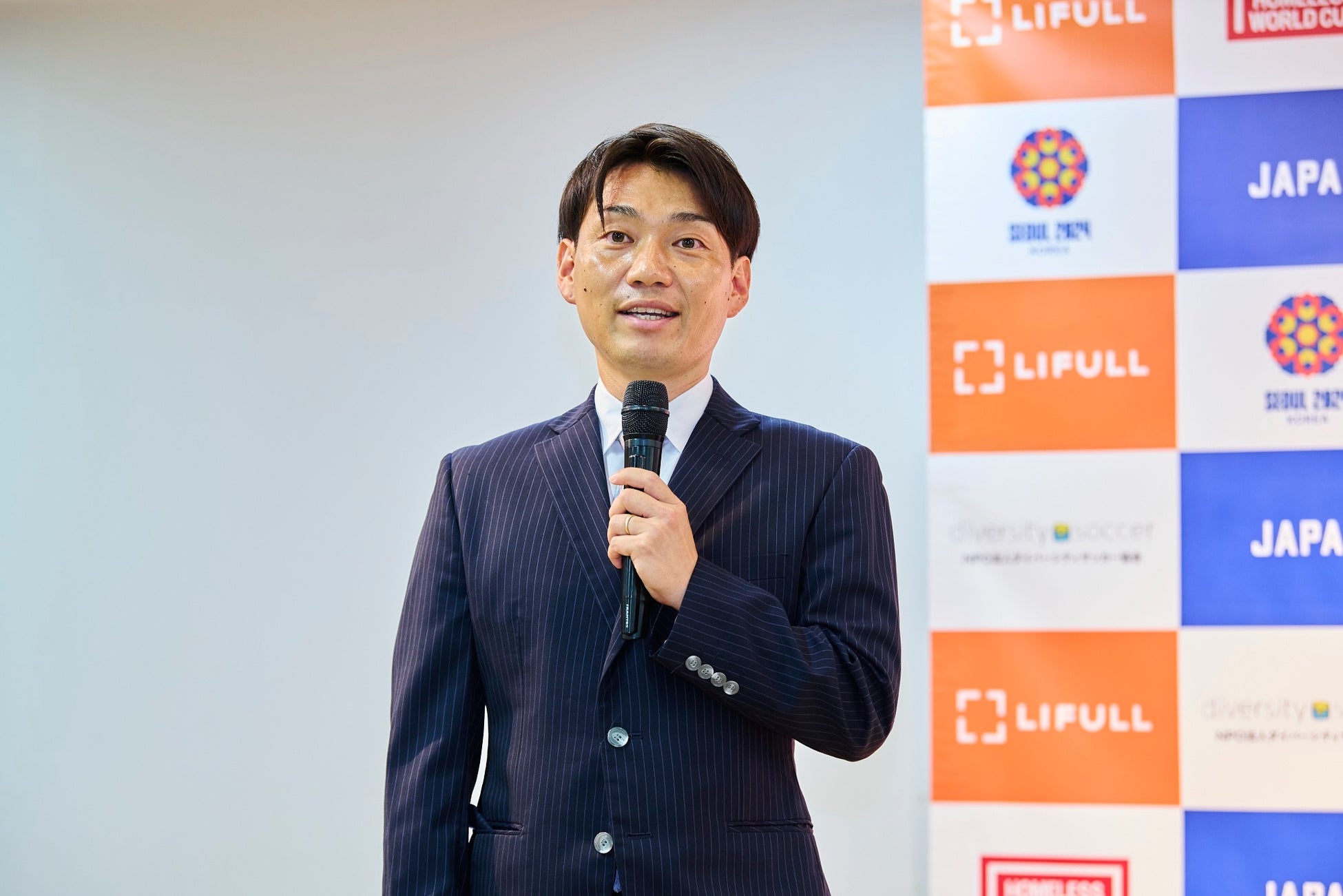 LIFULL執行役員の川嵜鋼平からLIFULLがこれまで不動産・住宅情報サービス「LIFULL HOME'S」を通して、ホームレス状態の方を含む生活困窮者や家族に頼れない若者などあらゆる人の叶えたい暮らしの実現をサポートしてきたことや、「ホームレス・ワールドカップ」の大会のビジョンである「ホームレスの存在しない世界」を目指すこと、大会への出場を当事者の方々が広義のホームレス状態である不安定な居住環境から抜け出すきっかけとすることに強く共感し、13年ぶりに大会に出場する日本代表チームのオフィシャルスポンサーとして挑戦をサポ―トするため、スポンサーに就任したことを説明しました。