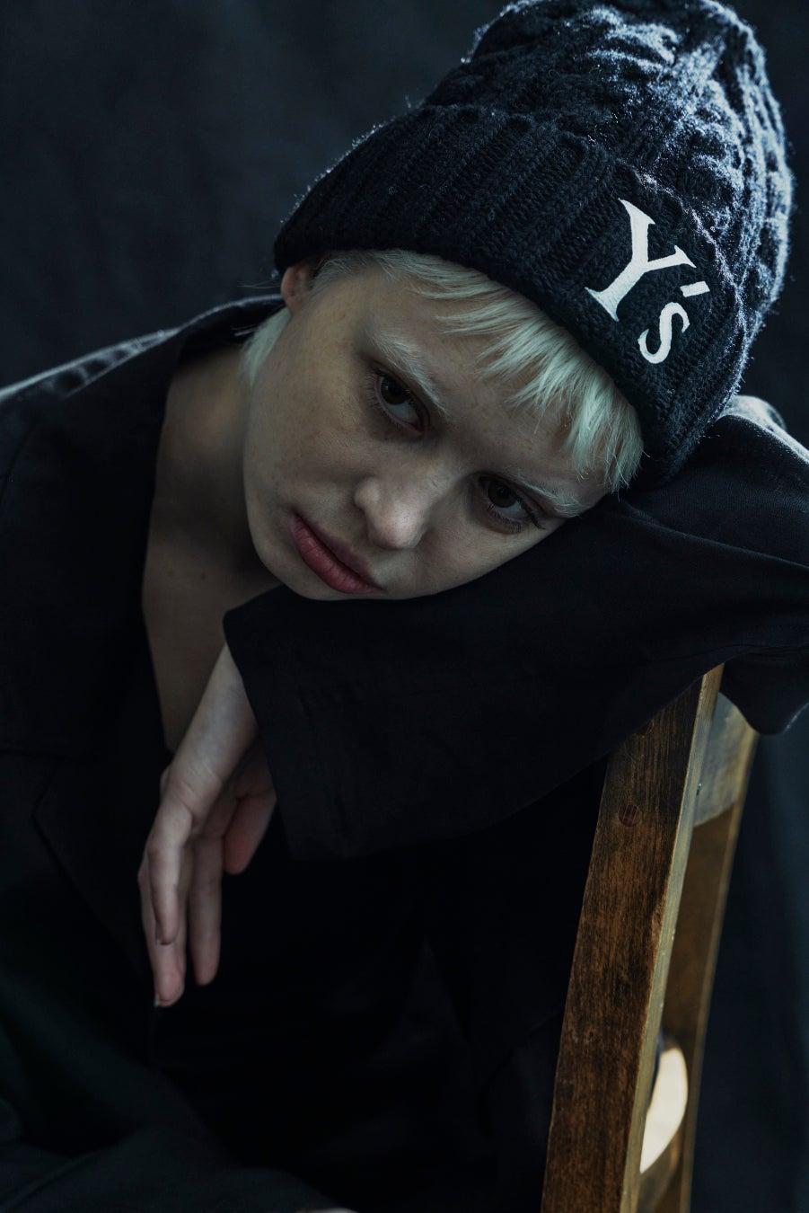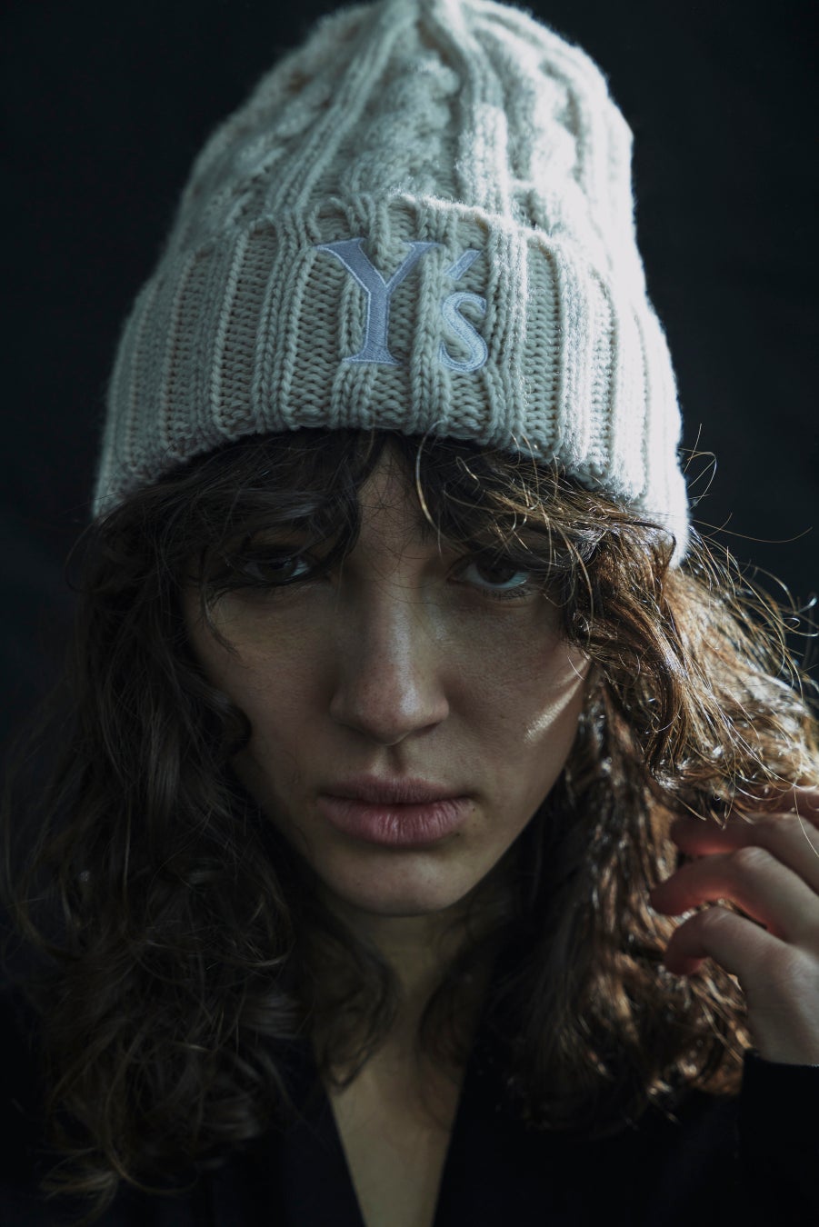 クラウン部分はケーブル編み、カフ部分はリブ編みに仕上げたローゲージカフニット。製品洗い加工による柔らかな肌触りが特徴。シンプルにフロント中央に配された「Y's」ロゴが、オーセンティックなロゴニットキャップの印象をつくる。