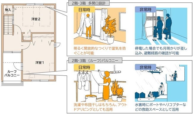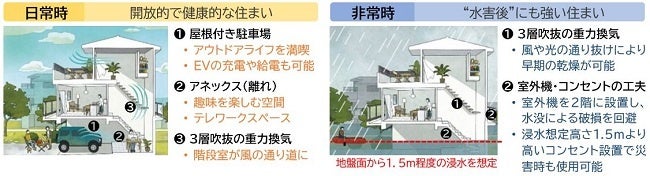 フェーズフリーをコンセプトに開発した本商品は、1階に屋根付き駐車場とアネックス、2階・3階に居住空間を集約しています。階段室は3層にわたり吹き抜けとなっており、重力換気により風が通り抜ける空間を設けることで、水害時に湿気を帯びた建物を早期に乾燥させることが可能な設計としています。また、1階のコンセントを天井付近の高い位置に、エアコンの室外機は2階以上に設置するなど、水害時の水没による破損を回避できるような配慮も取り入れています。