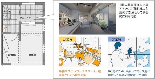 本商品では、1階を浸水した場合でも早期復旧が比較的容易な打ち放しコンクリート※1 仕上げのRC造(鉄筋コンクリート造)とし、屋根付き駐車場やアネックス(離れ)を配置しています。そして、浸水の可能性が極めて低い2階・3階を木造2×4工法とし、居住空間を集約することで被災直後や復旧作業時でも入居者様が避難や退去をせず、自宅での生活を継続できる設計とすることで賃貸事業の継続性を向上しています。