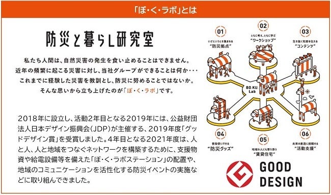 「ぼ・く・ラボ」では、人と人、人と地域をつなぐネットワークを構築するため、全国にある当社の支店を、支援物資や給電設備などを備えた防災拠点「ぼ・く・ラボステーション」※2 として運営しています。各拠点では、地域コミュニケーションの活性化を目的とした防災イベントなども開催しています。